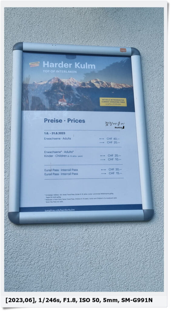 위치는 인터라켄 동역에서 서역쪽으로 2~3분만 걸어가면 우측으로 강을 건널 수 있는 다리가 나오는데 그 다리 건너면 바로 하더쿨룸 전망대로 올라갈 수 있는 푸니쿨라 매표소가 나옵니다.