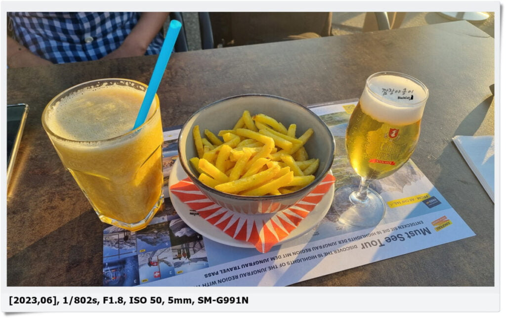 전망대에서 인터라켄을 내려다 보며 사진을 찍는 사이 식당에도 빈좌석이 났네요. 저는 맥주를 와이프는 망고주스를 한잔씩 주문해 잠시 여유를 즐겼는데요.