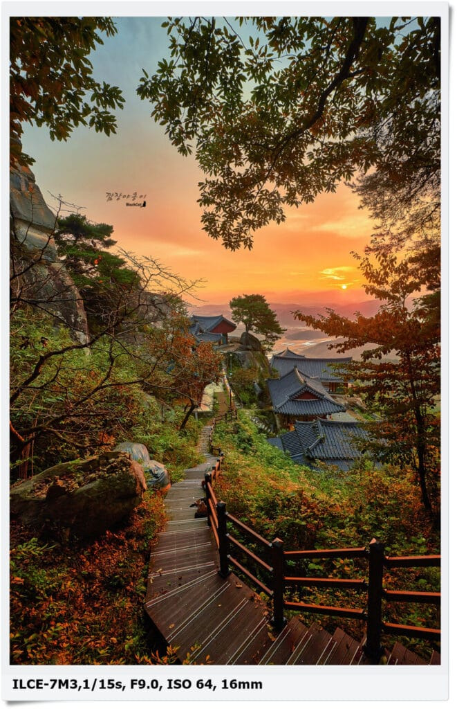 절 뒤로 나 있는 목조계단이 첫번째 포토스팟이자 메인입니다. 이곳에서 일출을 촬영한다면 꼭 꼬불꼬불 S자 모양의 목조계단 휘어짐이 함께 화면에 나오도록 촬영하시면 됩니다.