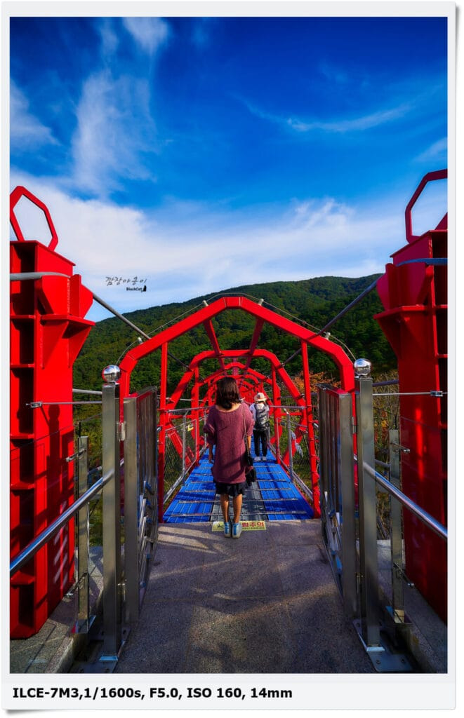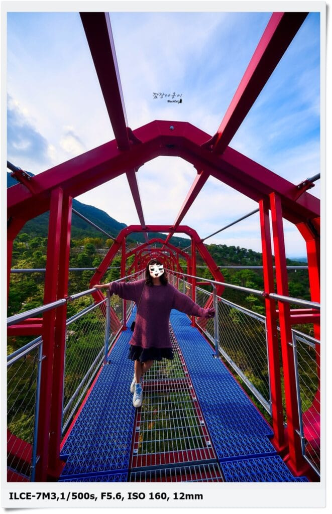 엄청 튼튼해 보이는데 생각보다 흔들림은 좀 있습니다. 확실히 흔들다리 맞습니다! 와이프가 처음에는 다리가 흔들려서 주춤하더니 점점 익숙해지는지 나중에는 포즈도 취하고 예상보다 잘 걸어가네요.