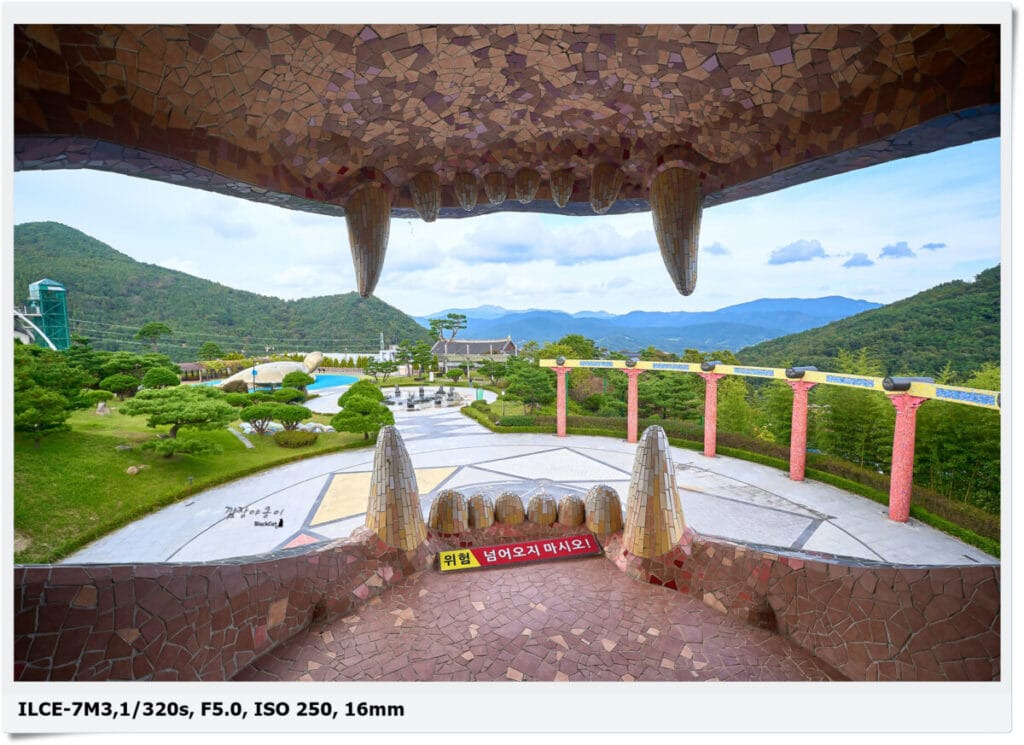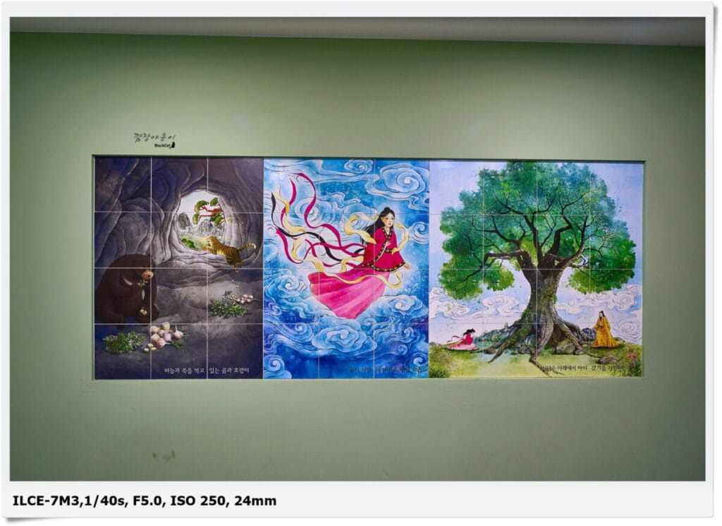 작은 광장 앞에 곰이 있네요. 사실 이 곰은 전망대로 내부로 들어 갈 수 있는데 곰이 웅녀가 되는 과정을 담은 삽화가 1층에 있고 계단을 이용해 2층으로 올라가면 곰의 입 사이로 밖을 내다 볼 수 있도록 되어 있답니다.