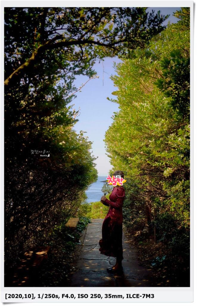 사진을 찍으며 시원한 바람을 맞으며 파란 바다와 푸른 숲길을 걷다보면 어느순간 오른쪽으로 바다가 보이기 시작할텐데요.