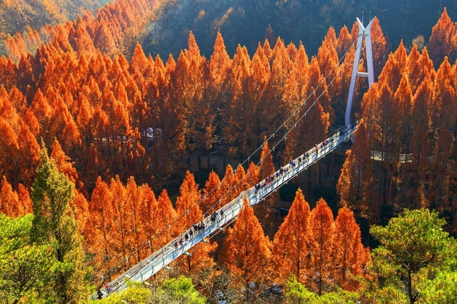 🔍장태산 자연휴양림(홈페이지)은 국내에서 가장 큰 규모의 메타세콰이어 숲이 있는 곳으로 140m의 출렁다리에서 바라보는 모습이 멋진 곳입니다.