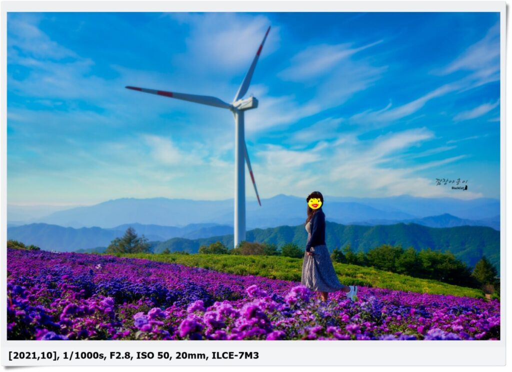 처음 방문한 곳은 거창에 위치하고 있는 감악산 풍력발전단지 앞에 있는 아스타 국화로 보통 국화는 8월~10월에 피며 분홍색, 흰색 등 여러가지 색상의 꽃이 있는데 이곳 감악산에서 피는 아스타 국화는 보라색을 띄고 있다고 합니다.
