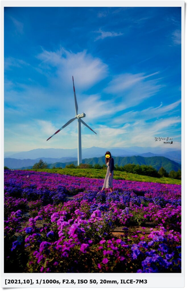 처음 방문한 곳은 거창에 위치하고 있는 감악산 풍력발전단지 앞에 있는 아스타 국화로 보통 국화는 8월~10월에 피며 분홍색, 흰색 등 여러가지 색상의 꽃이 있는데 이곳 감악산에서 피는 아스타 국화는 보라색을 띄고 있다고 합니다.