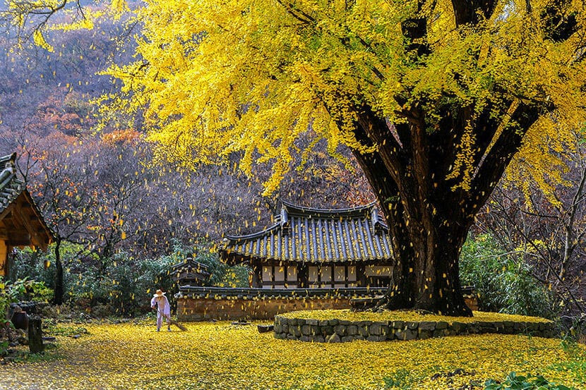 늦가을 이 거대한 은행나무가 바람에 흩날리며 떨어트리는 은행잎을 보기 위해 수많은 관광객이 이곳을 방문하는데요.