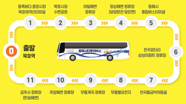 대중교통을 이용해 방문하시는 분이라면 묵호역/ 동해 종합버스터미널을 거쳐 무릉별유천지까지 순환하는 동해시티투어버스를 이용하셔도 됩니다.