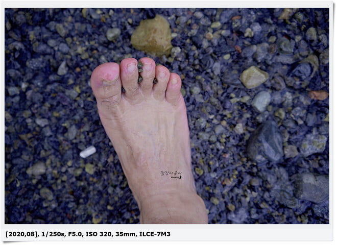 일반 모래해변이었다면 맨발로 다니는 순간 발바닥 뿐만 아니라 거의 온몸 전체에 모래가 달라 붙어 찝찝함이 이루 말할 수 없는데요. 거제 몽돌해변은 모래대신 돌로 되어 있어 모래로 인한 찝찝함은 느낄 수 없어 좋았네요.