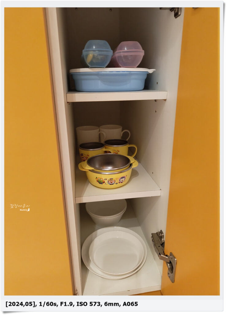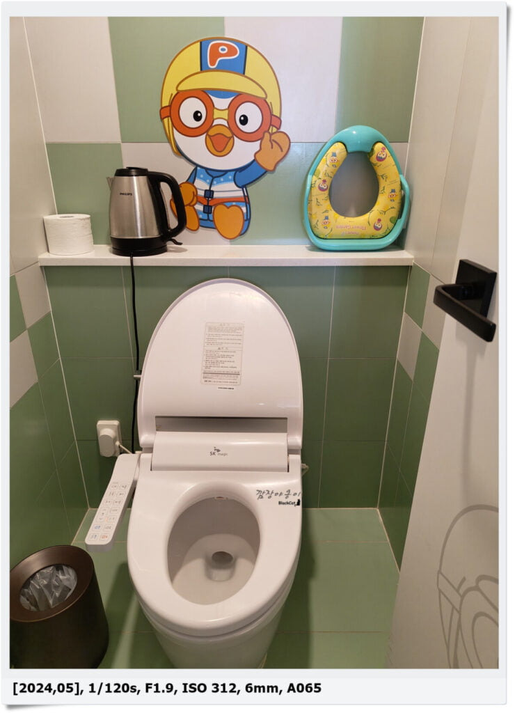 아무래도 아이들이 있는 부모님들이 주로 예약하는 방이다 보니 빨래건조대도 비치되어 있고 체구가 작은 아이들을 위한 어린이용 변기커버 및 어린이용 식기도 준비되어 있습니다.