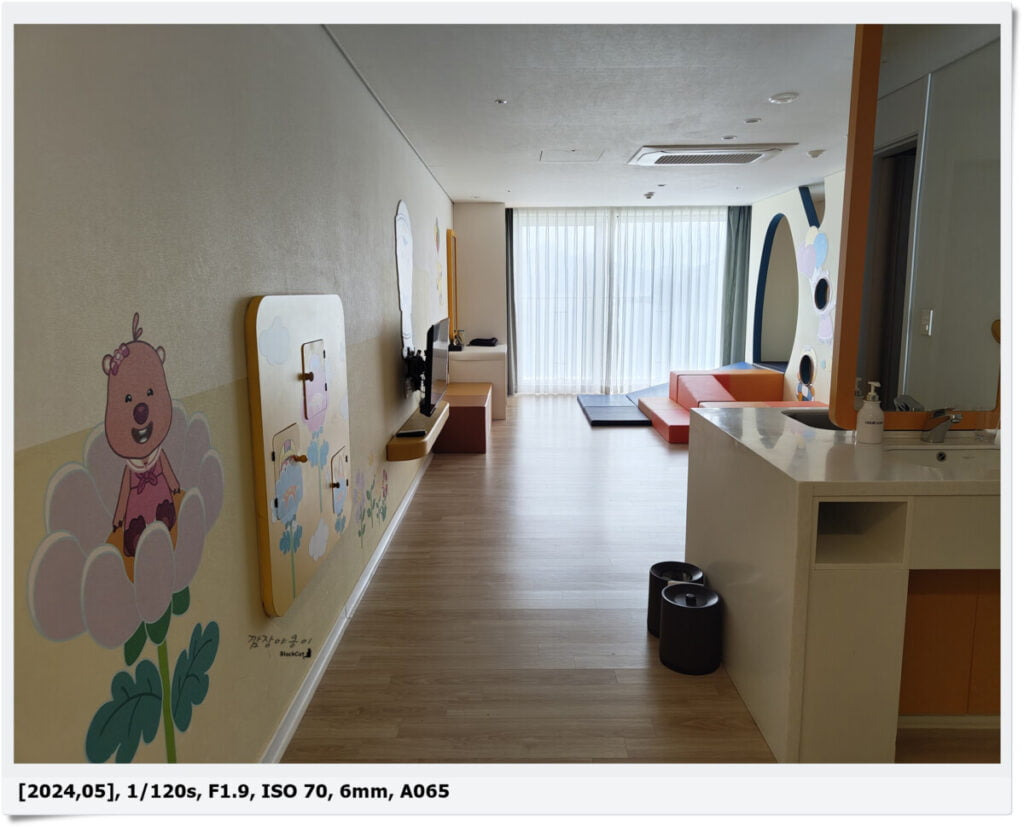 내부 벽지부터 뽀로로 캐릭터를 이용했고 침대가 없는 대신 방안에서도 아이들이 뛰어 놀 수 있는 작은 놀이터가 준비되어 있답니다. 밤에 누우려고 보니 이불도 캐릭터 이불이네요 ㅎ
