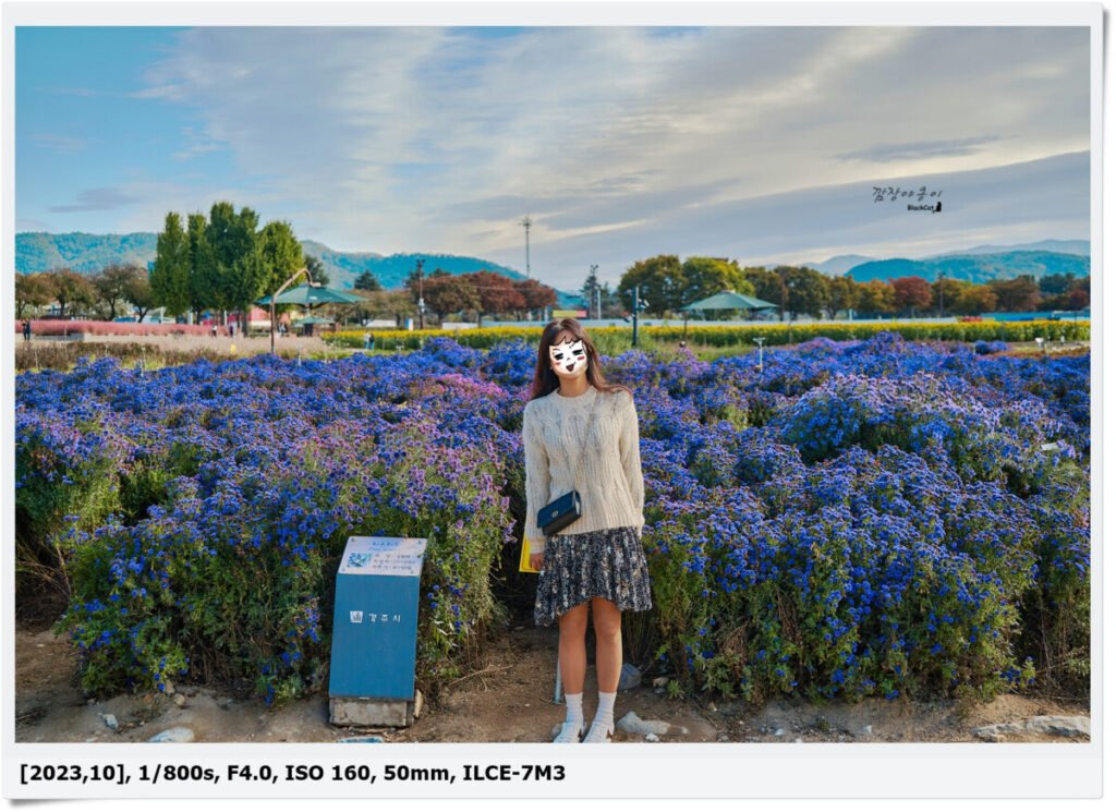 해바라기, 핑크뮬리 외에도 첨성대 주위에는 바늘꽃과의 백접초, 아스타 국화 등 다양한 꽃들이 심어져 있었는데 노란색의 일반 국화도 많이 있던데 그 꽃은 화분채로 가져다 둔걸 보니 심어두고 키우는 꽃이 아닌 행사를 위해 잠시 가져다 둔 애들인가 보네요.