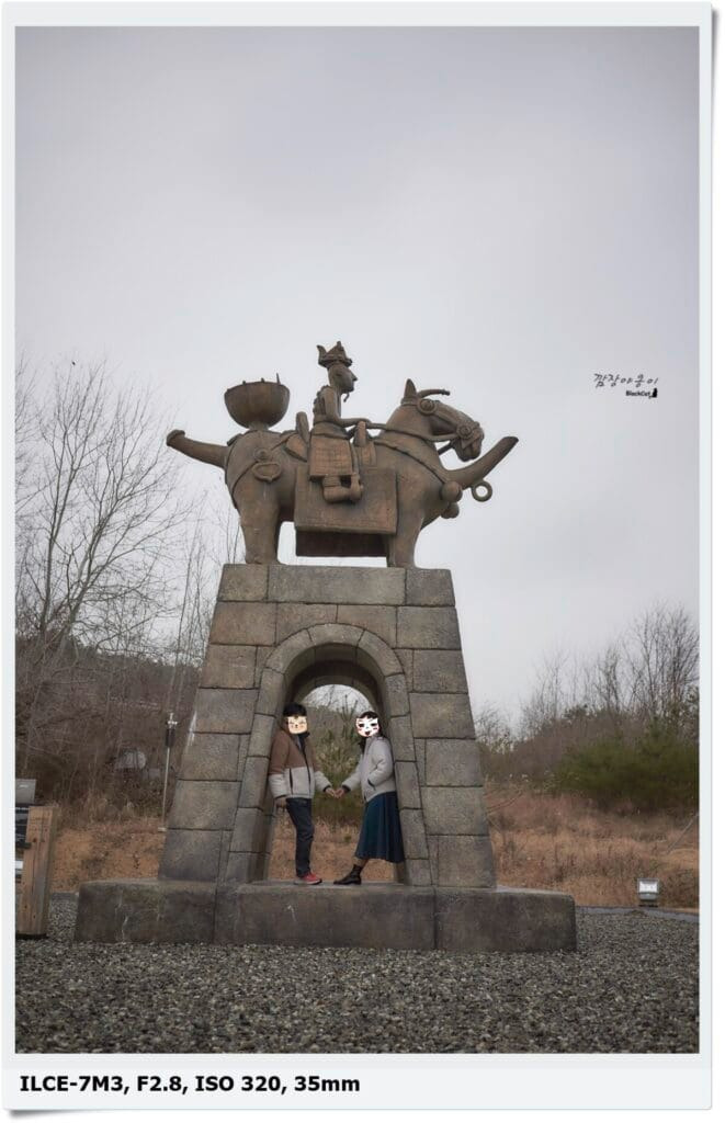 신라시대에 제작된 것으로 추정되는 기마인형토기를 모티브로 제작된 조각물로 당시의 의복과 말 장식을 알 수 있는 신라 문화를 대표하는 유물 중 하나로 국보 제91호로 지정되어 있으며 실제 기마인형토기는 국립 박물관에 전시되어 있습니다.