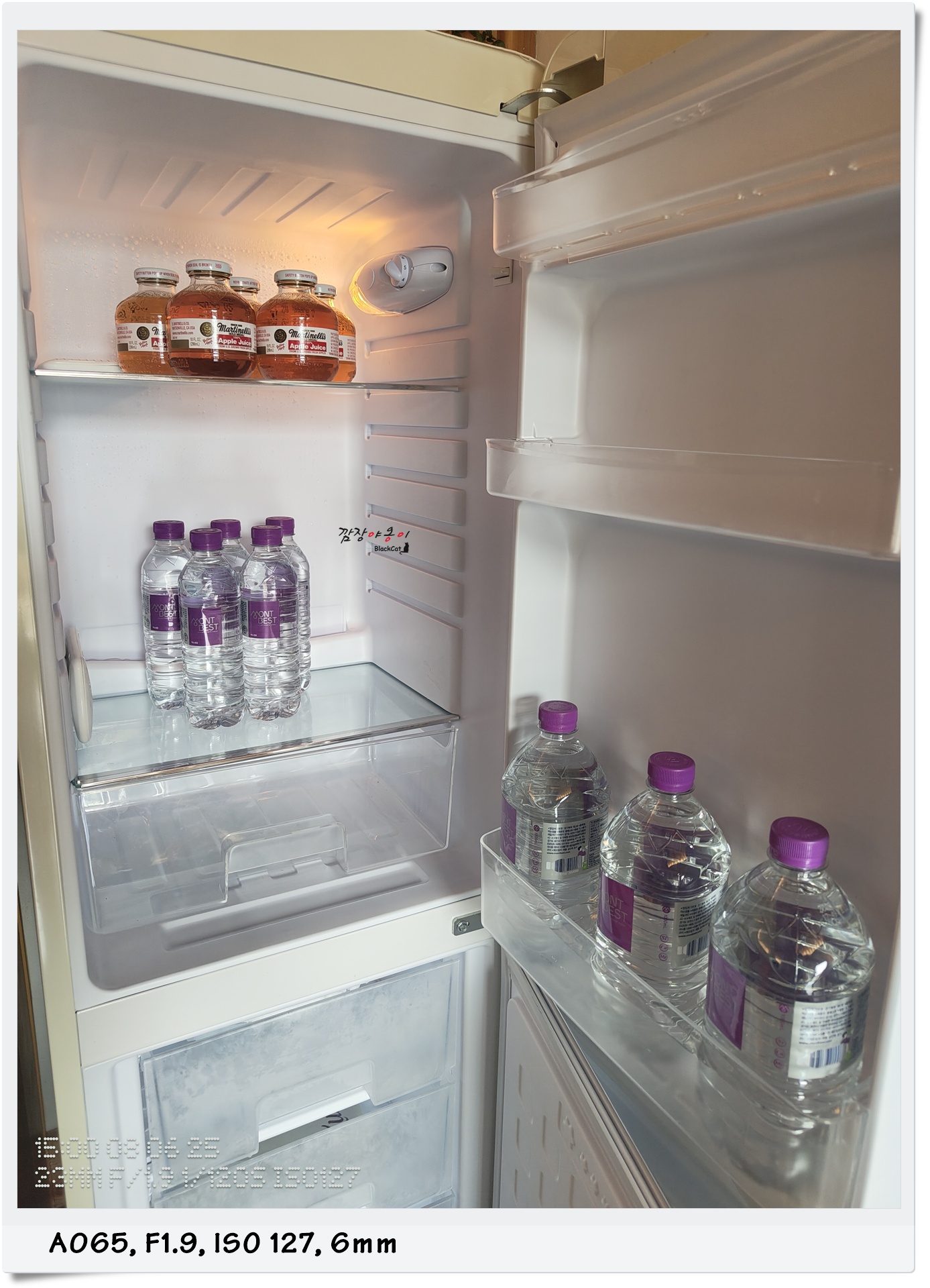 참고로 소곤정에는 정수기가 없습니다. 그래서 인지 냉장고에 물이 한가득 들어 있었네요. 그리고 서비스로 인원수에 맞게끔 사과쥬스도 넣어주셨네요.