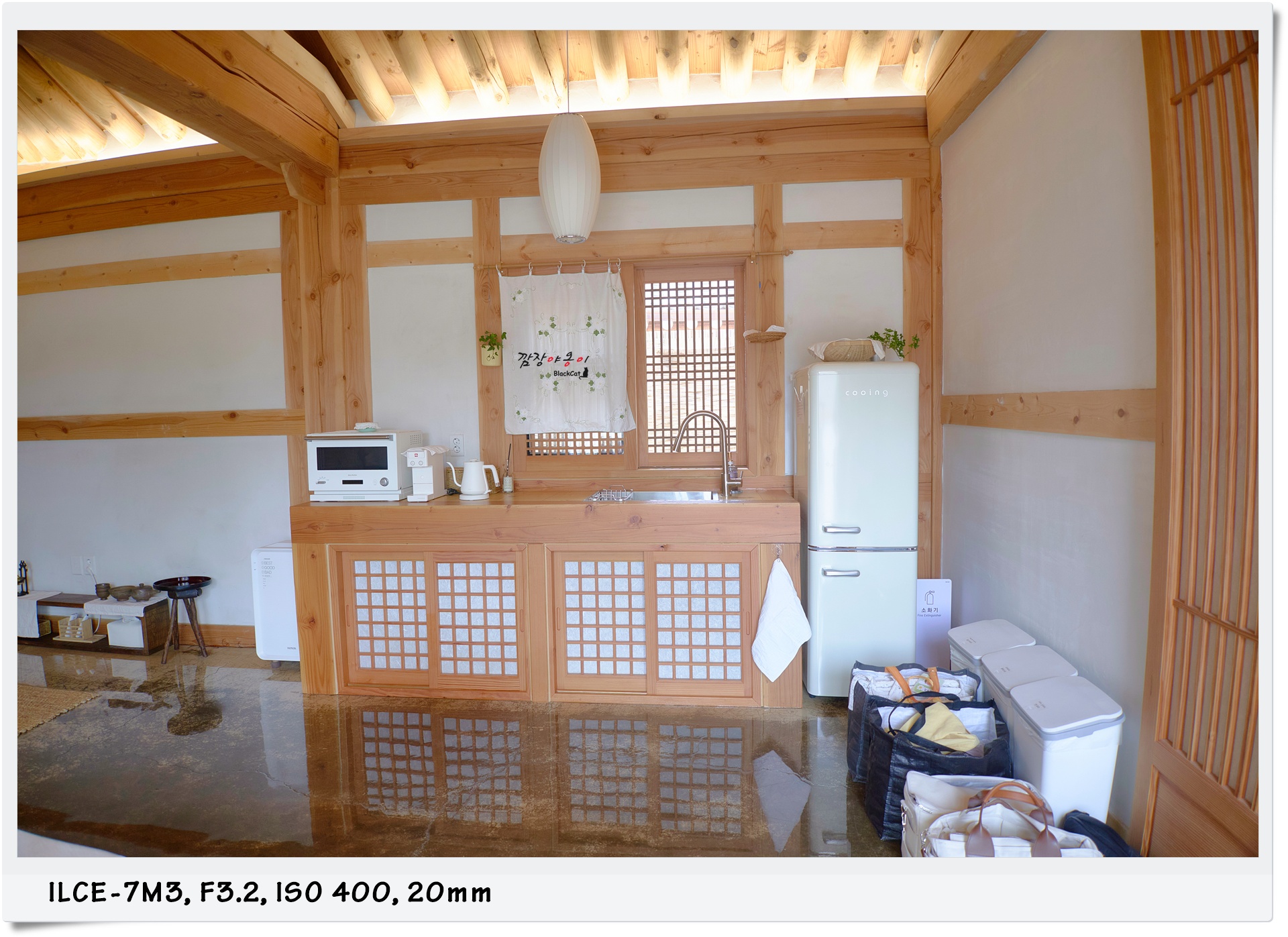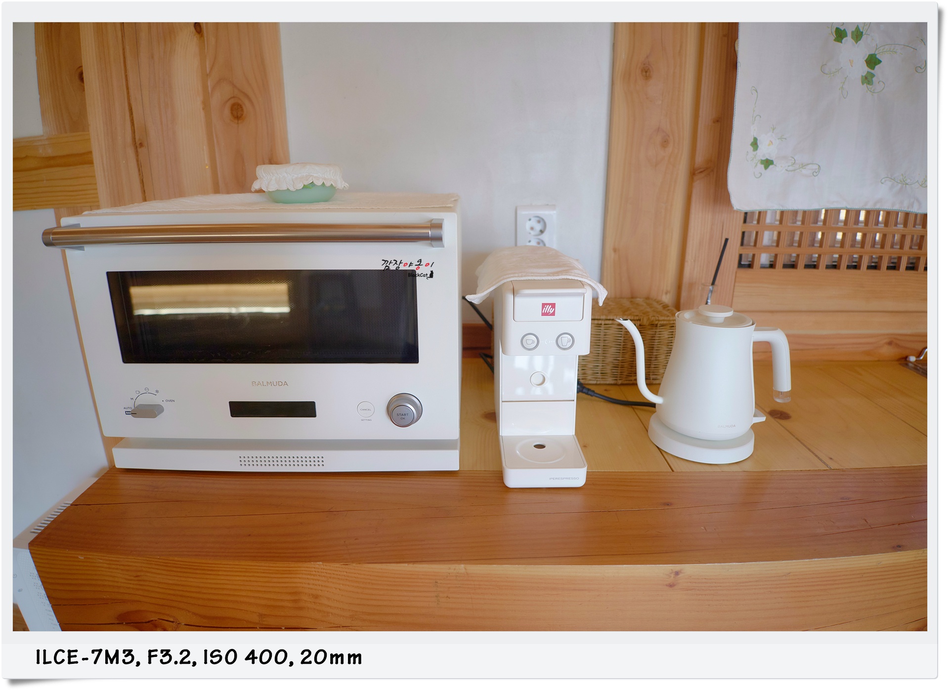 현대와 옛날이 공존하는 공간입니다. 70~80년대 쓰던 낡은 선풍기, 골동품 상점에서나 볼 수 있을거 같은 각종 장신구 그리고 에어컨과 밀거다니며 볼 수 있는 스탠바이미 TV까지 있으며 주방엔 죽은 빵도 살린다는 발뮤다 오븐과 맛있는 커피를 내릴 수 있는 일리 커피머신 등이 준비되어 있답니다.
