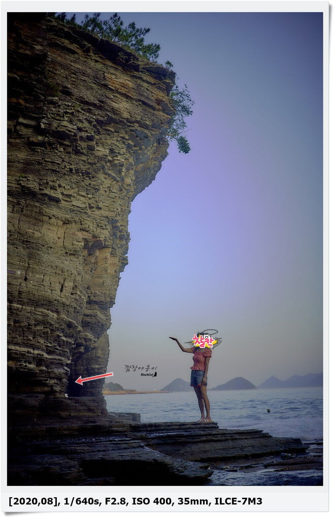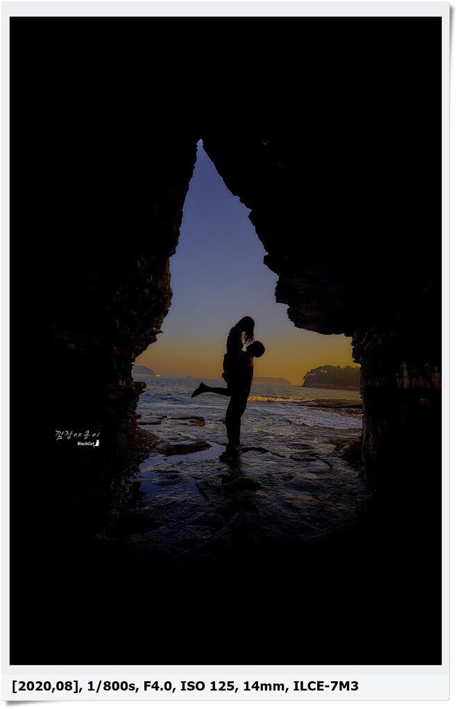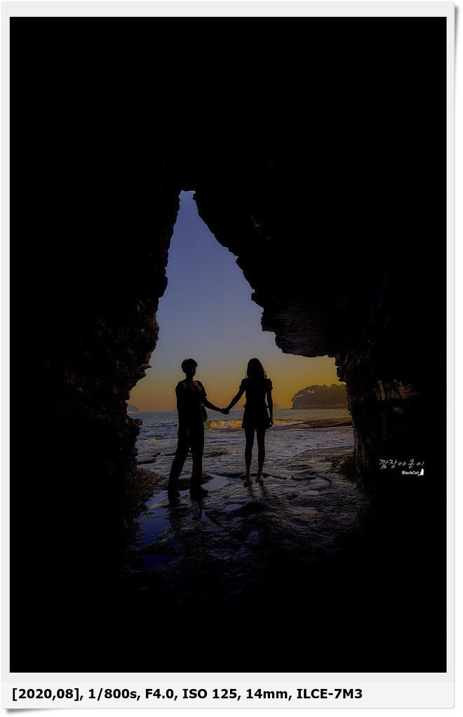 우리가 찍을땐 그나마 파도가 잠잠해서 바닷물이 동굴 내부 깊숙히는 들어오지 않았는데 우리 다음분들 찍을때는 파도가 심했는지 남자분이 쫄닥 젖어서 나오셨네요. 동굴 안쪽에 바다로 이어지는 길이 있서 바닷물이 파도 따라 들어오던데 아무래도 깊숙히 들어가신게 아닌지.. 앞에서만 찍으셔도 되는데;; 다른분들도 파도 조심하세요~