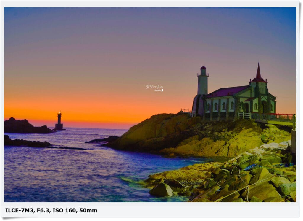 포토존 액자가 있는데 사진이.. 없네요;; 성당 우측에는 포토존으로 액자 모양의 조형물이 있습니다. 이곳에서 사진을 찍으면 뒤쪽으로 푸른 바다와 맑은 하늘을 배경으로 한컷의 즉석사진 같은 프사를 남길 수 있답니다.