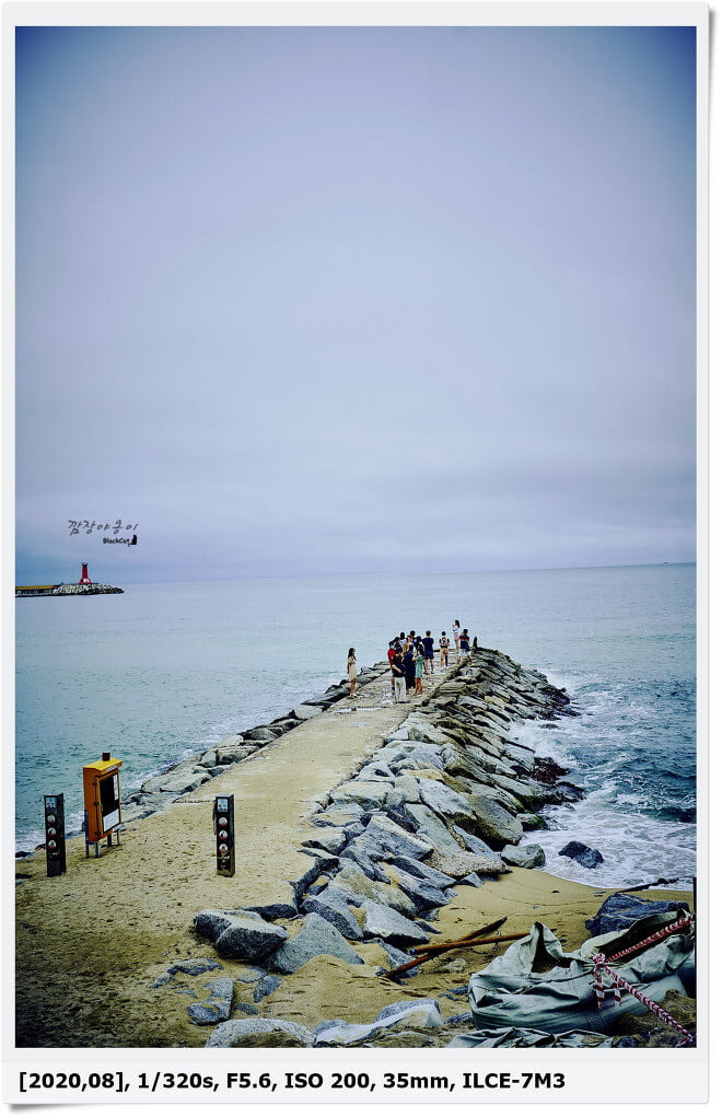 강릉의 주문진해변과 영진해변 사이에 위치해있는데요. 앞에 가서 보시면 이렇게 2개의 방사제가 있고 2곳이 거의 쌍둥이 처럼 닮은꼴이라 2곳에 나뉘어 줄서서 사람들이 드라마의 추억을 새기며 사진을 찍고 있는데요.