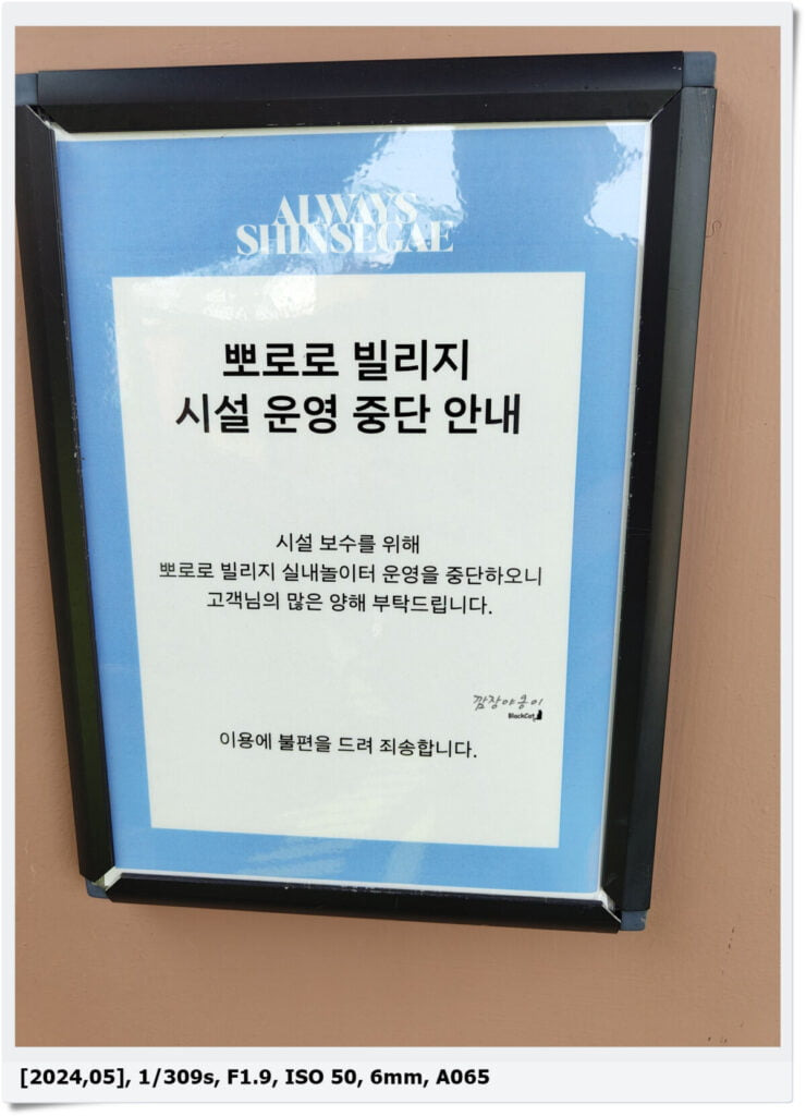 5월 중순 기준으로 뽀로로 빌리지 실내놀이터는 시설보수를 위해 사용이 중단된 상태고 VR하우스는 36개우러 이상 어린이부터 이용할 수 있어 막 2돌이 지난 햇살이는 이용불가였네요.