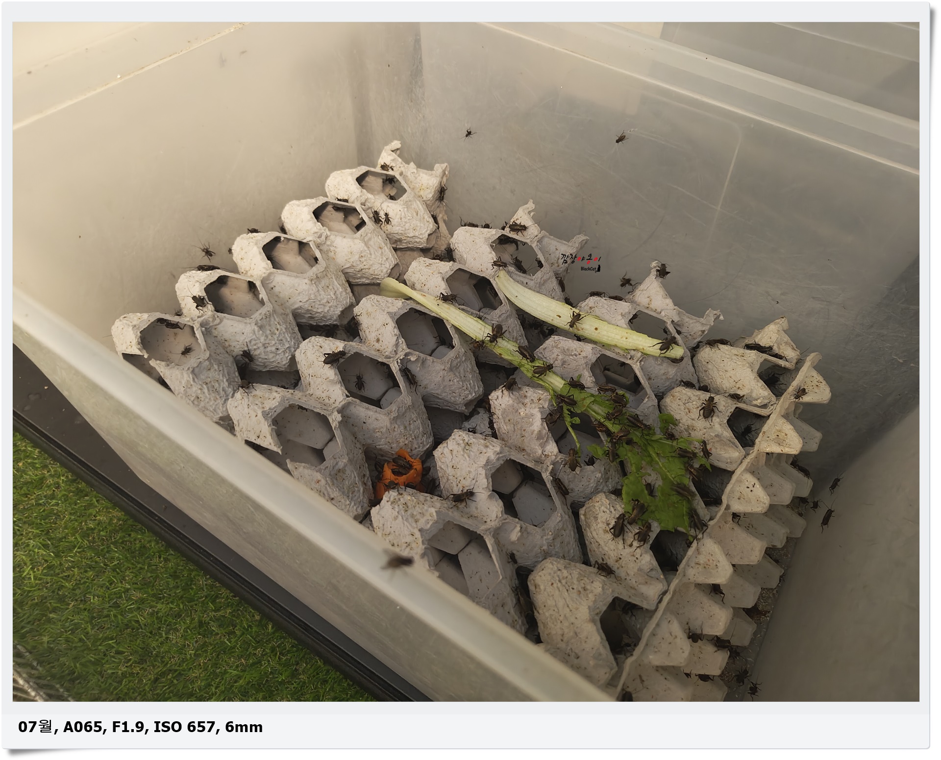 구석에 숨겨져 있던 귀뚜라미, 아마도 이녀석들이 먹이로 사용하기 위해 사육을 위한 사육을 당하는 중인거 같네요. 와이프가 이걸 봤으면 기겁 했을 듯 싶네요.
