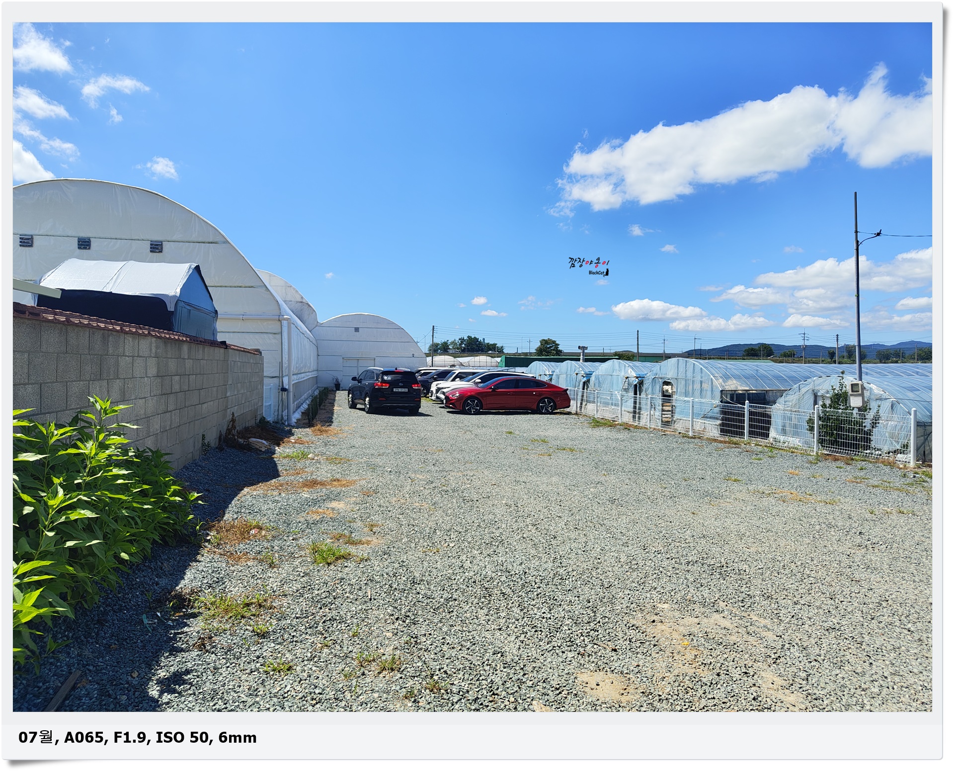 체험농장은 2개의 작은 하우스, 1개의 큰 하우스 그리고 1개의 cafe 동으로 이루어져 있고 옆에는 자갈밭에 주차장이 마련되어 있습니다.