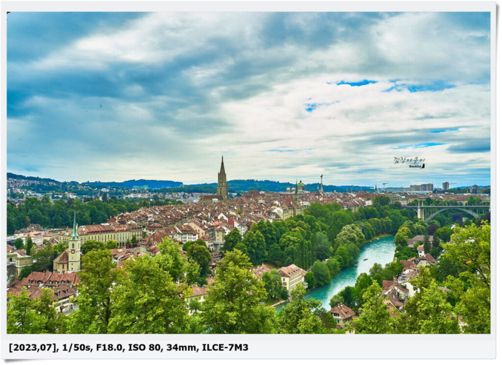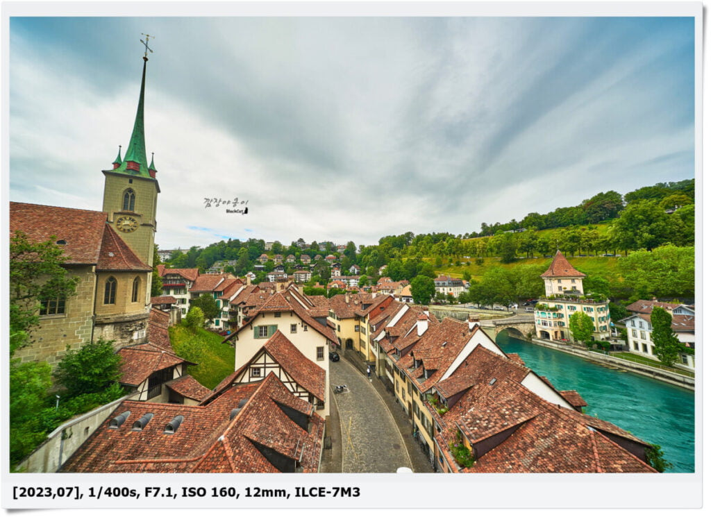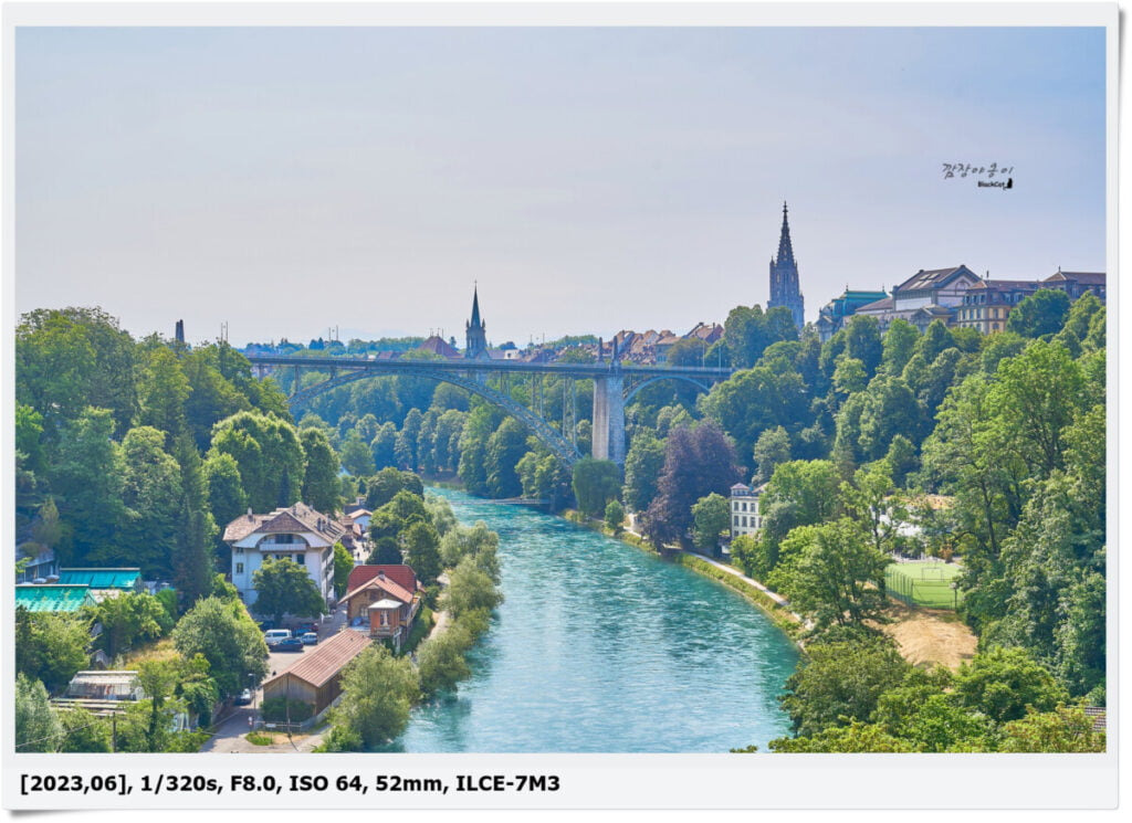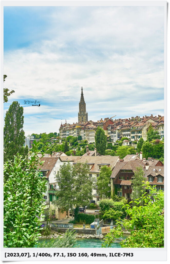 사진에 보이는 다리는 Kornhausbrücke이며 천주교 대성당인 Church of St. Peter and St. Paul과 뾰족한 탑이 상징적인 1400년대에 지어진 성당인 The Cathedral of Bern이 보입니다.