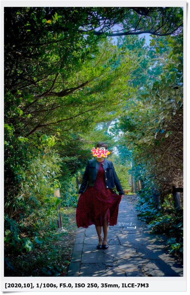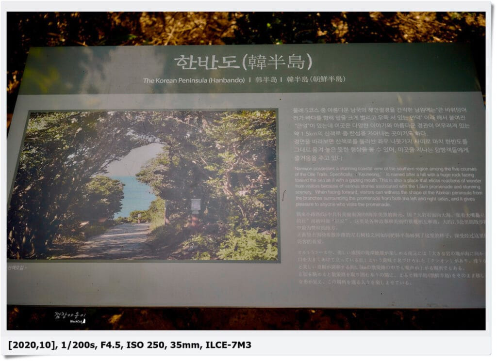 그럼 다시 숲으로 들어갈텐데요. 숲으로 들어가기 직전 오른편에 있는 바다와 절벽이 바로 위 사진에 있는 곳입니다. 숲길로 들어와서 30미터 정도만 더 들어오면 오른편에 나무의자들이 있고 오늘 포스팅에 첫 사진인 한반도를 찍어둔 푯말이 보입니다.