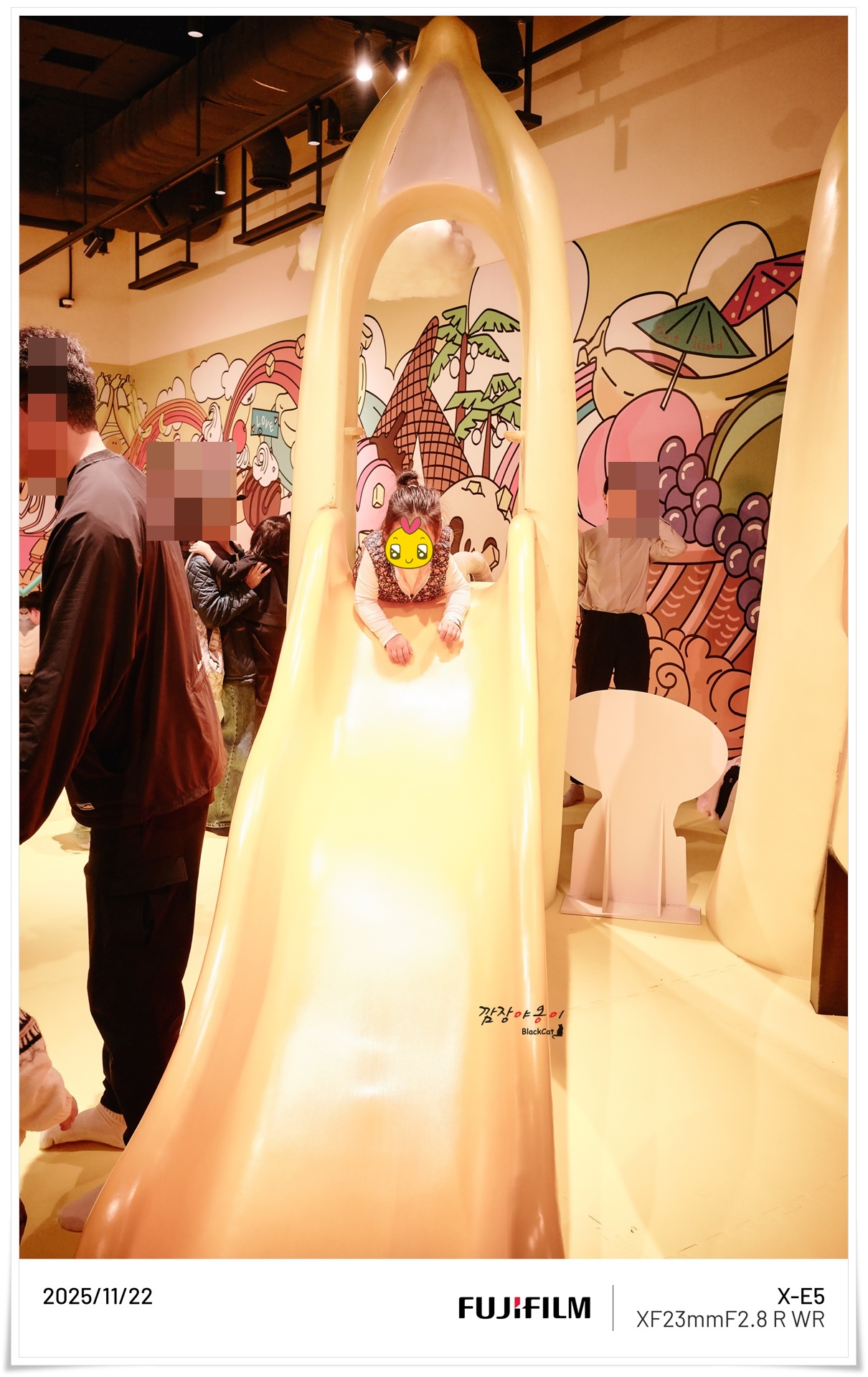 내부 엘리베이터를 타고 지하로 내려가면 거대한 바나나 모형과 함께 거대 볼풀장, 블럭쌓기, 바나나 미끄럼틀 타기등을 할 수 있습니다.