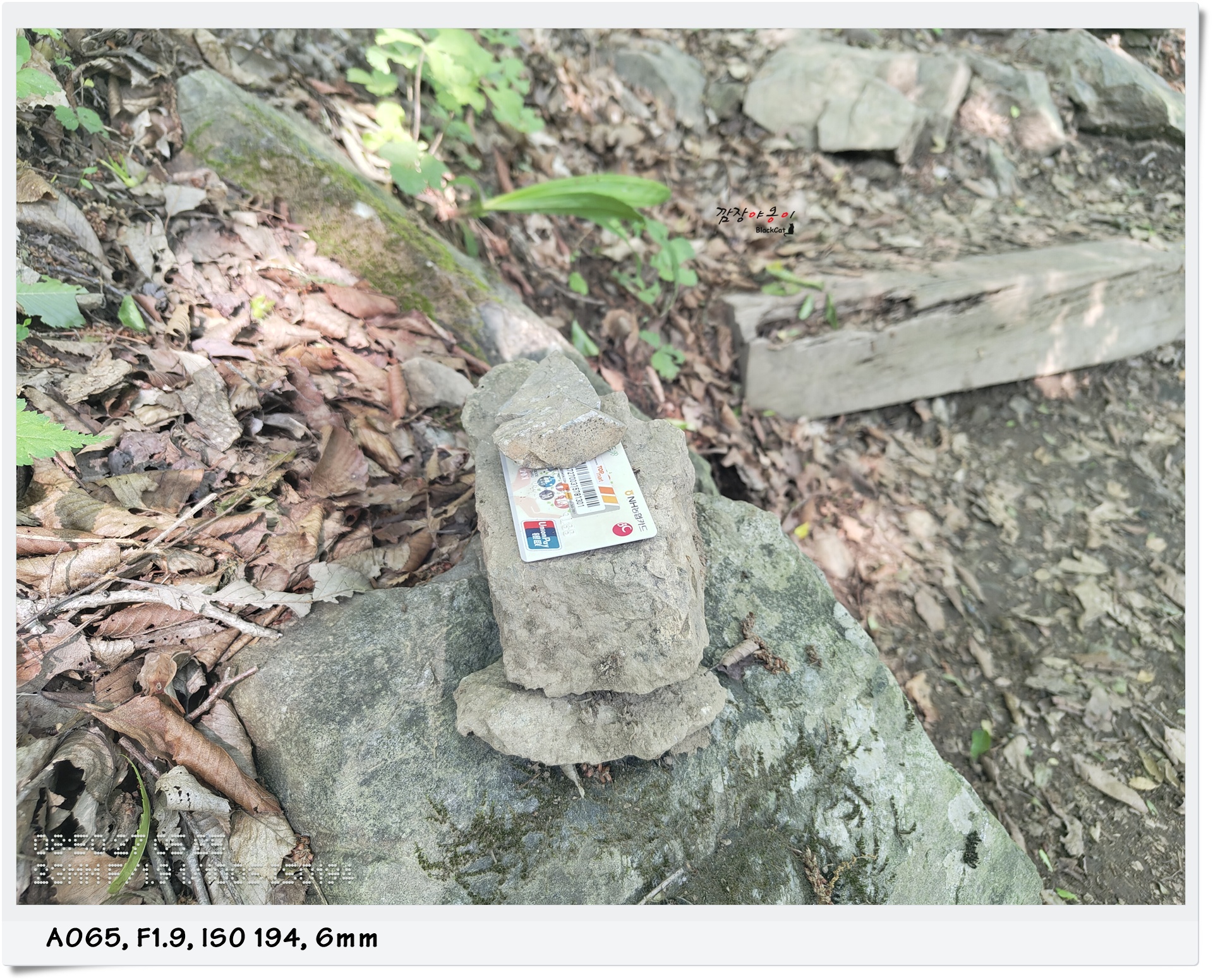 위치를 알려주는 마지막 노란 안내판을 지나자 말자 누군가가 흘리고 간 카드를 주워 이렇게 돌 사이에 끼워 놓으셨네요.