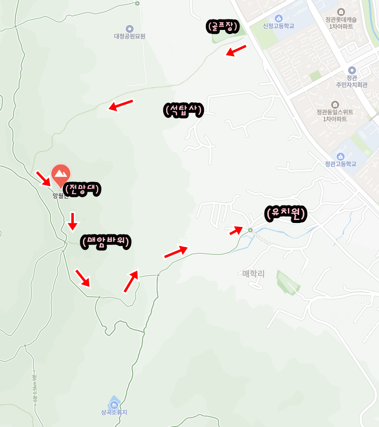 저처럼 산린이가 망월산 전망대를 가려한다면 유치원 방향으로 올라가지 마시고 골프장 방향에서 올라가는 것을 추천합니다.