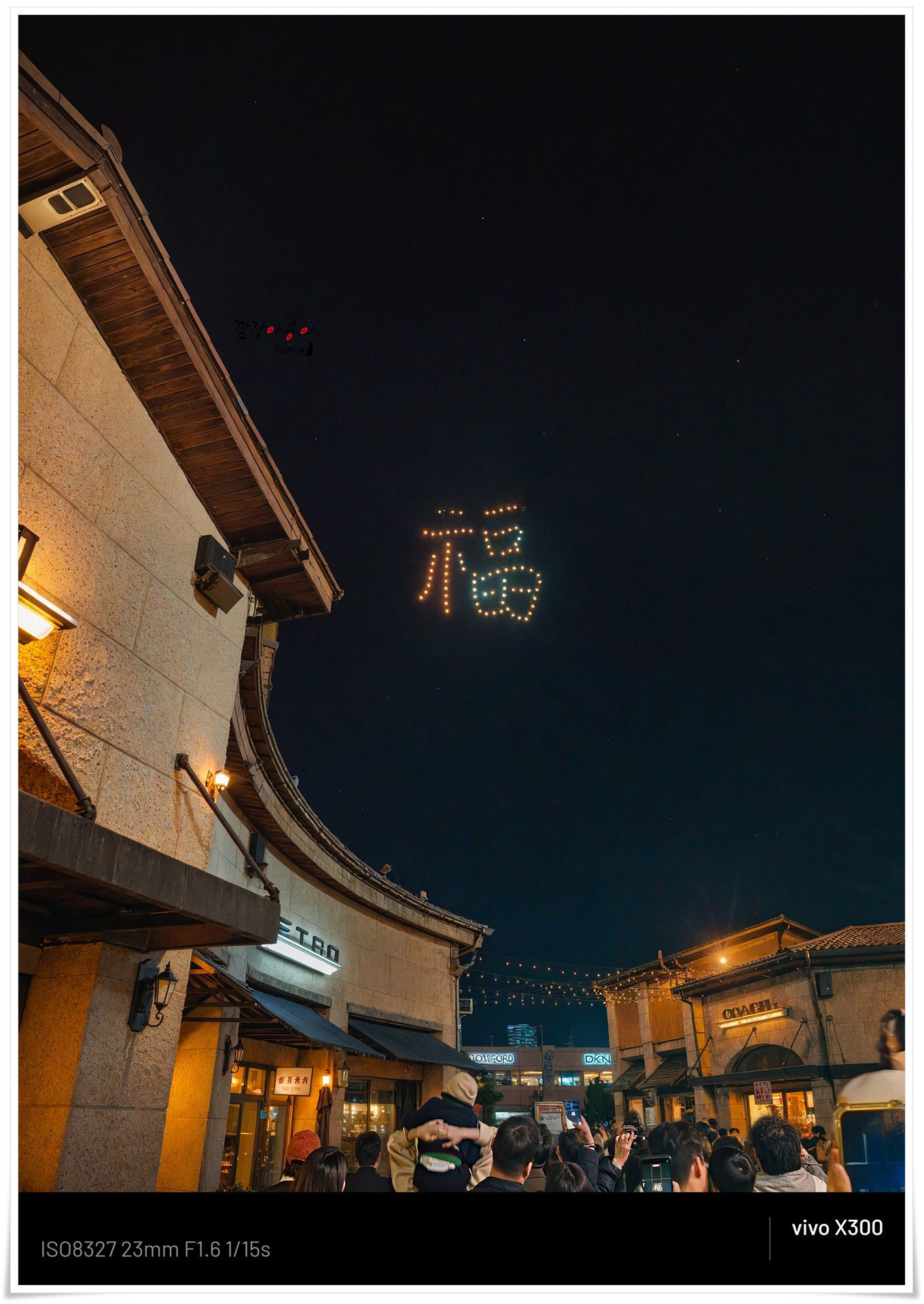 7시 땡~하자 사람들이 와~~하며 환호성을 지르길래 하늘을 바라보니 저 멀리서 수많은 드론들이 오색찬란한 빛을 내며 날아오고 있는 모습을 볼 수 있었네요.
