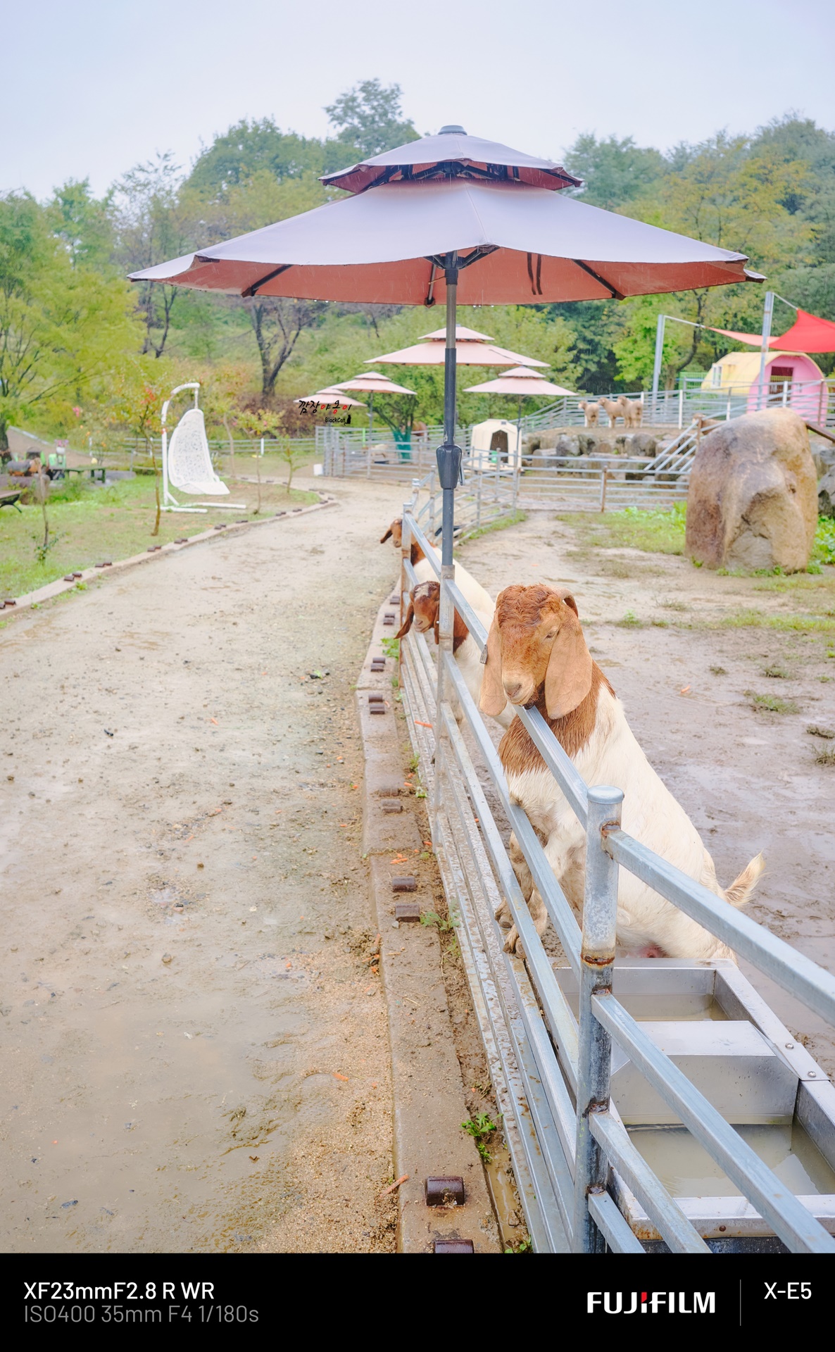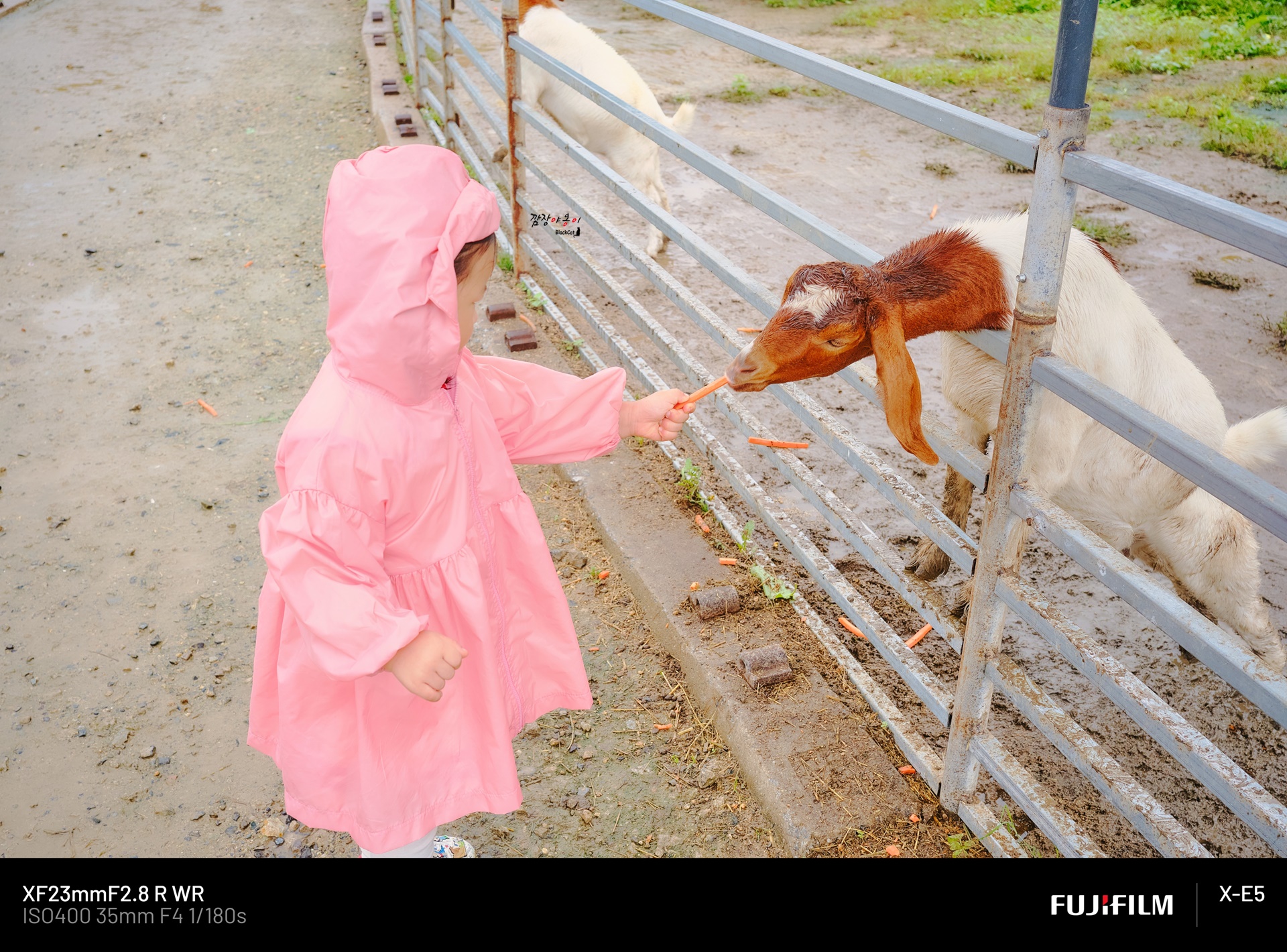 보어라는 염소인데 생긴게 개와 소의 그 중간쯤인거 같네요. 비에 쫄딱 젖어 피신할만도 한데 당근을 보자 하나 둘 모여들기 시작합니다.