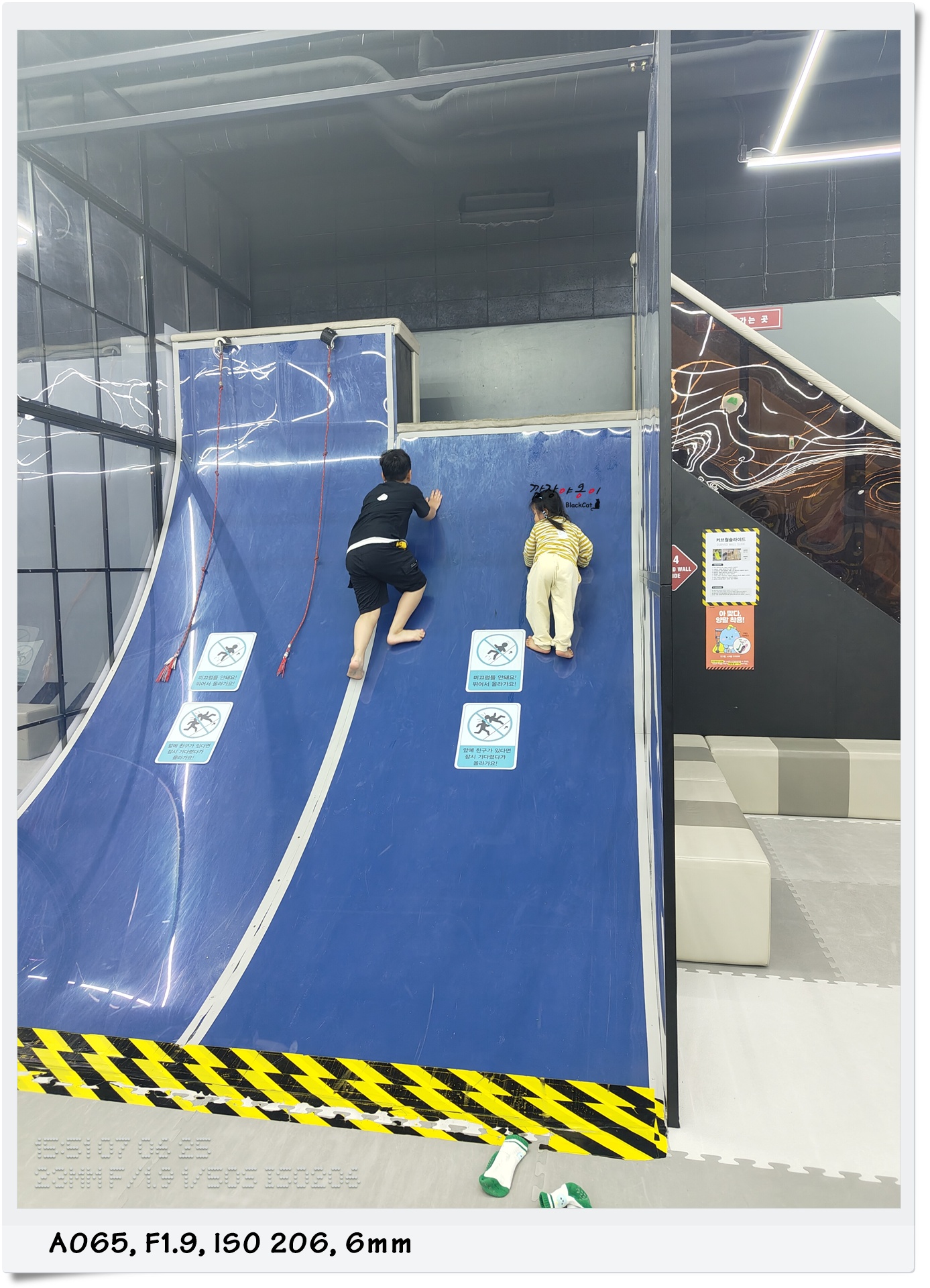 옆에 끈을 잡고 올라가서 힘으로 버티며 넘어가야 하는데 아직은 요령이 없는 40개월이랍니다. 우다다닥 올라가서 옆으로 내려오면 되는데 초등학생 어린이들은 곧잘하네요.