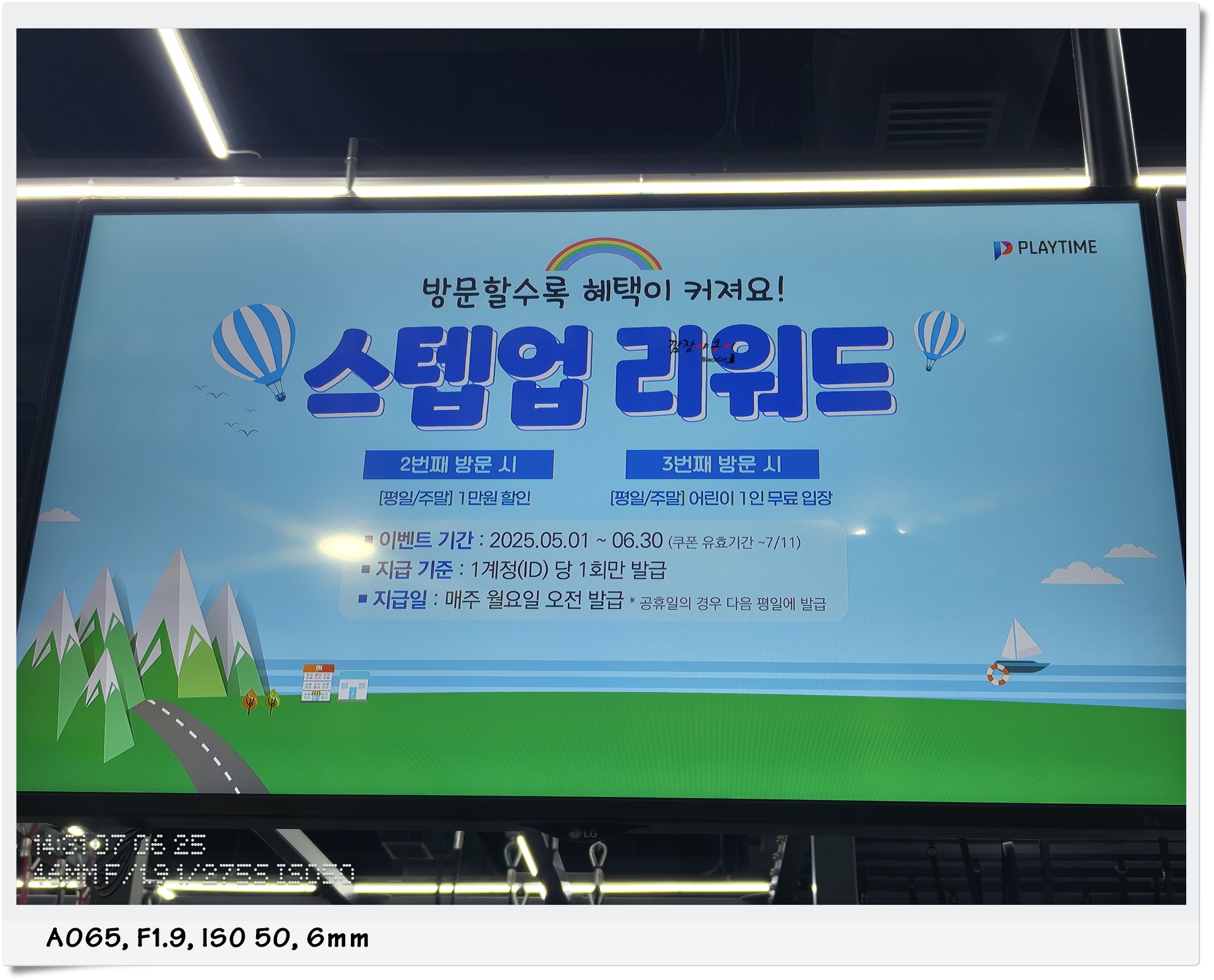 5~6월 한정 이벤트로 2번째 방문시 평일/주말 상관 없이 1만원 할인, 3번째 방문시 평일/주말 상관 없이 어린이 1인 무료입장 쿠폰을 받을 수 있습니다.