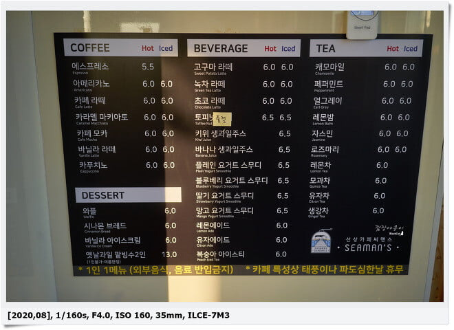 앞서도 이야기 했듯이 카페가 바다위에 배처럼 떠있다 보니 앉아서 먹다보면 파도에 따라 조금씩 흔들립니다. 날씨만 좋다면 크게 문제될건 없지만 조금씩 흔들리다 보니 앉아 있다보면 살짝 멀리가 나는거 같기도 하네요.