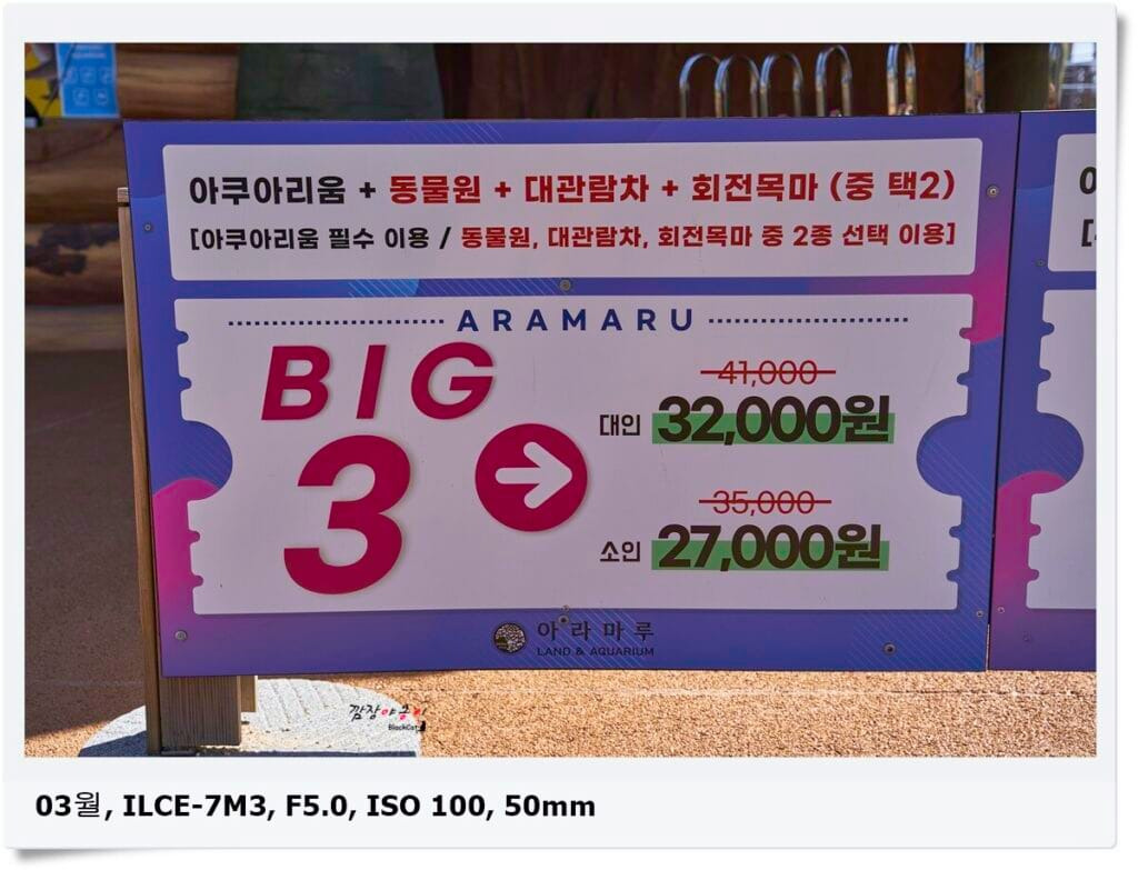 아라마루 아쿠아리움은 총 3개의 파트로 나뉘어 있는데 하마가 있는 아쿠아리움/ 야외 동물원/ 야외 놀이기구로 나뉩니다. 동물원, 회전목마는 가격이 비싸지 않은데 메인이 되는 아쿠아리움 가격이 비싼편입니다.