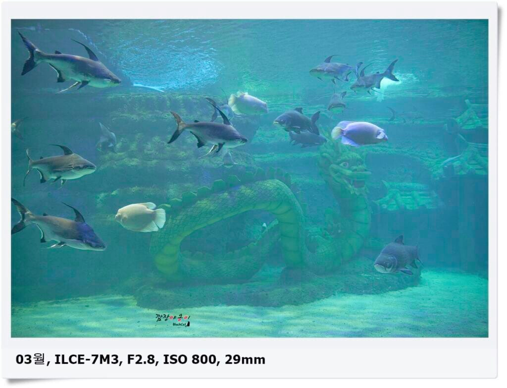 이곳은 용궁? 용왕을 조각해둔 물속에는 샴 잉어, 징기스칸 메기, 자이언트 민물 가오리, 쥴리에니, 가이양, 앵츄이 등 가양한 물고기들이 살고 있네요.
