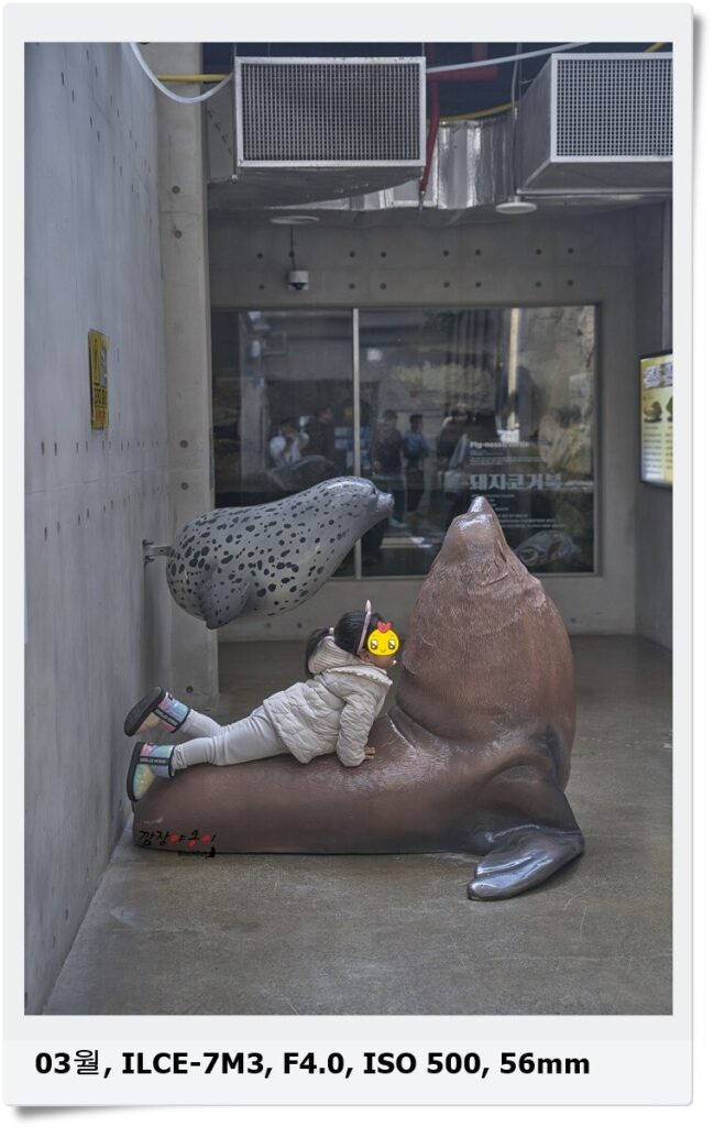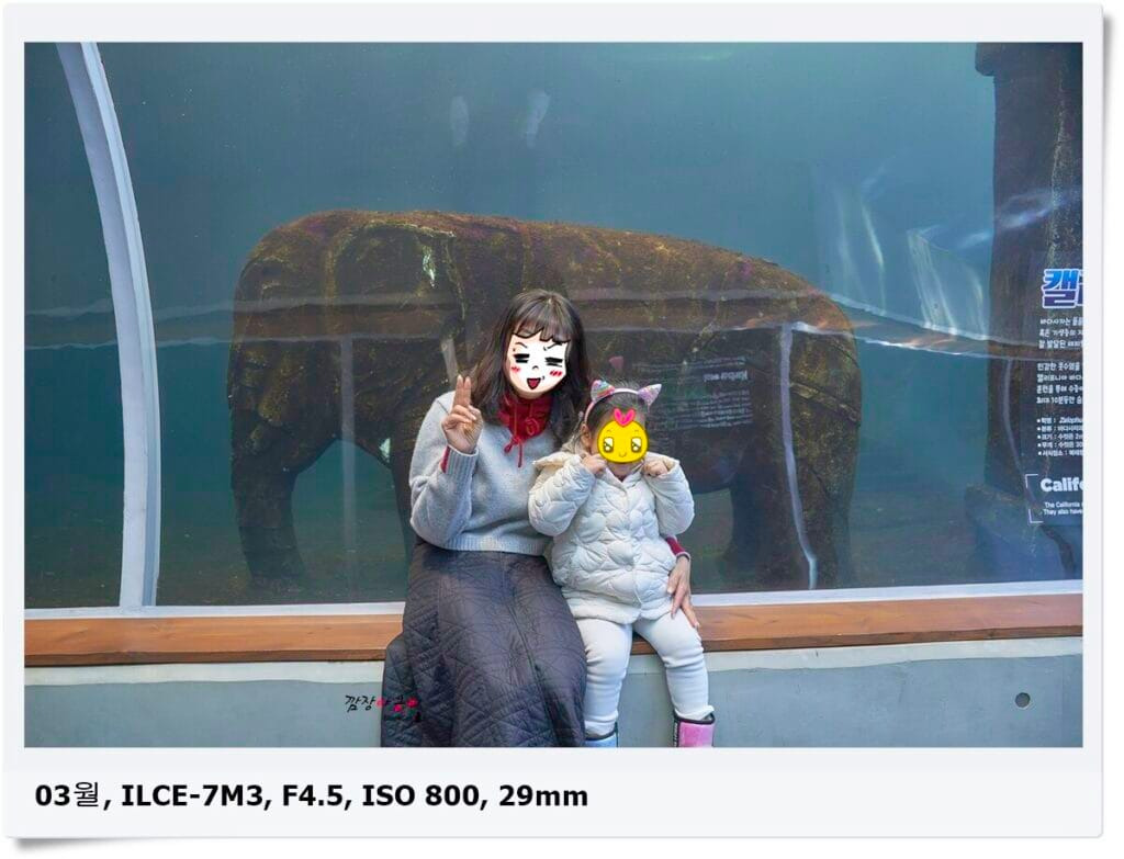 관람객이 많은 주말이었음 엄두도 못냈겠지만 한산한 평일에 방문을 했더니 이렇게 거북이 모형에 쏙들어가 거북이가 된 것처럼 헤엄도 치고 바다사자 모형 위에 올라가 바다사자 마냥 똑같이 몸을 쭉~ 펴보기도 하면서 동물이 된 것 처럼 가상의 체험을 하기도 했답니다.