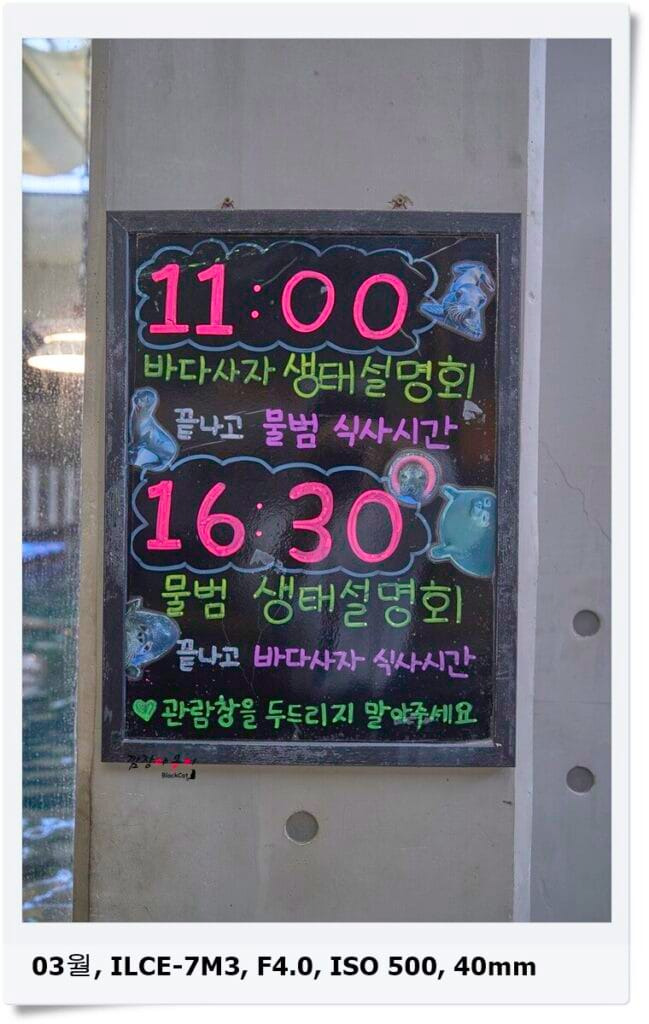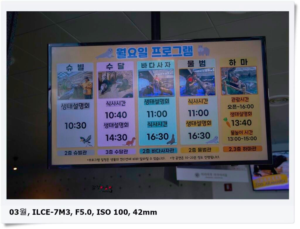 오전에는 슈빌의 생태설명회, 바다사자 생태설명회가 있고 오후시간대엔 수달 생태설명회와 물범 생태설명회, 하마 생태설명회가 있습니다.