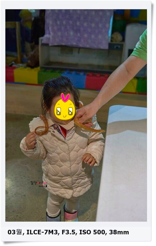 1층으로 오니 파충류 체험관이 있습니다. 여러 파충류들이 있던데 역시나 햇살이는 뱀 한마리를 만져도 보고 목에 걸어도 보고 별 무서움 없이 좋아하네요.