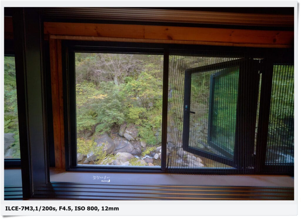 계곡 옆에 붙어 있어 창문을 통해 계곡 및 푸르름을 볼 수 있고 밤새 물소리를 들을 수 있어 백색소음이 있어야 마음이 진정되고 잠이 잘 오는 분이라면 적극 추천할 만 합니다.