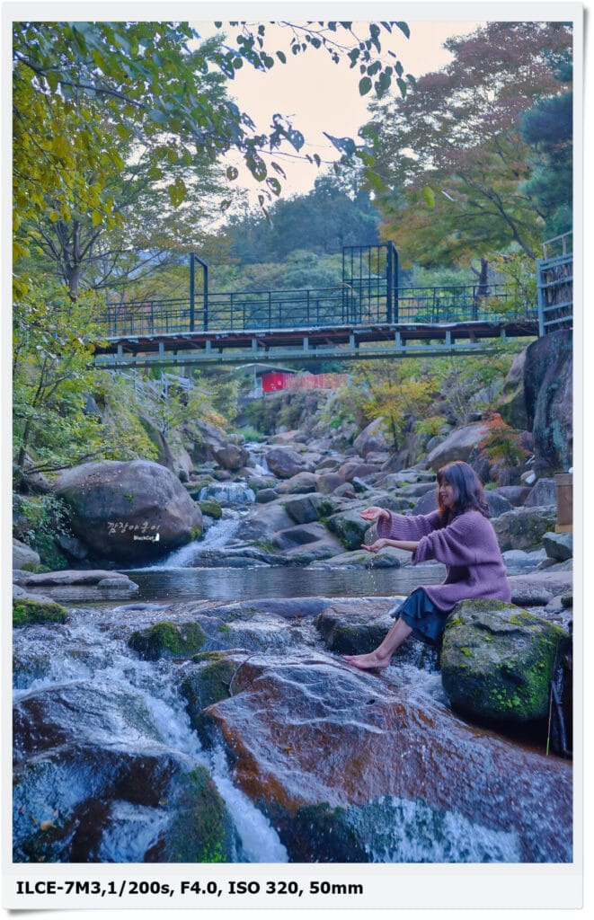 바로 앞에는 산에서 흘러내려오는 실개천이 있습니다. 지하수나 산에서 내려오는 물은 평소에도 차가운 편인데 10월이라 더더욱 춥네요. 전 발만 살짝 담궜다 바로 빼버렸는데 와이프는 그래도 물장구도 치고 나름 펜션에서 즐길 수있는 것들을 뺴놓지 않고 하나씩 하고 있네요.