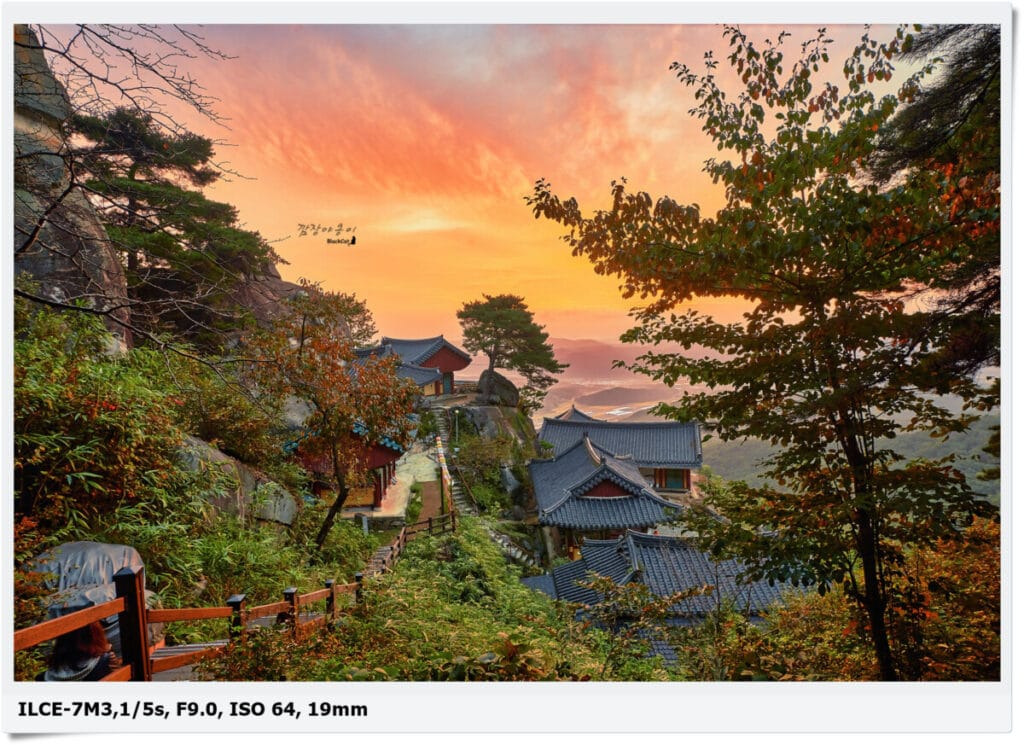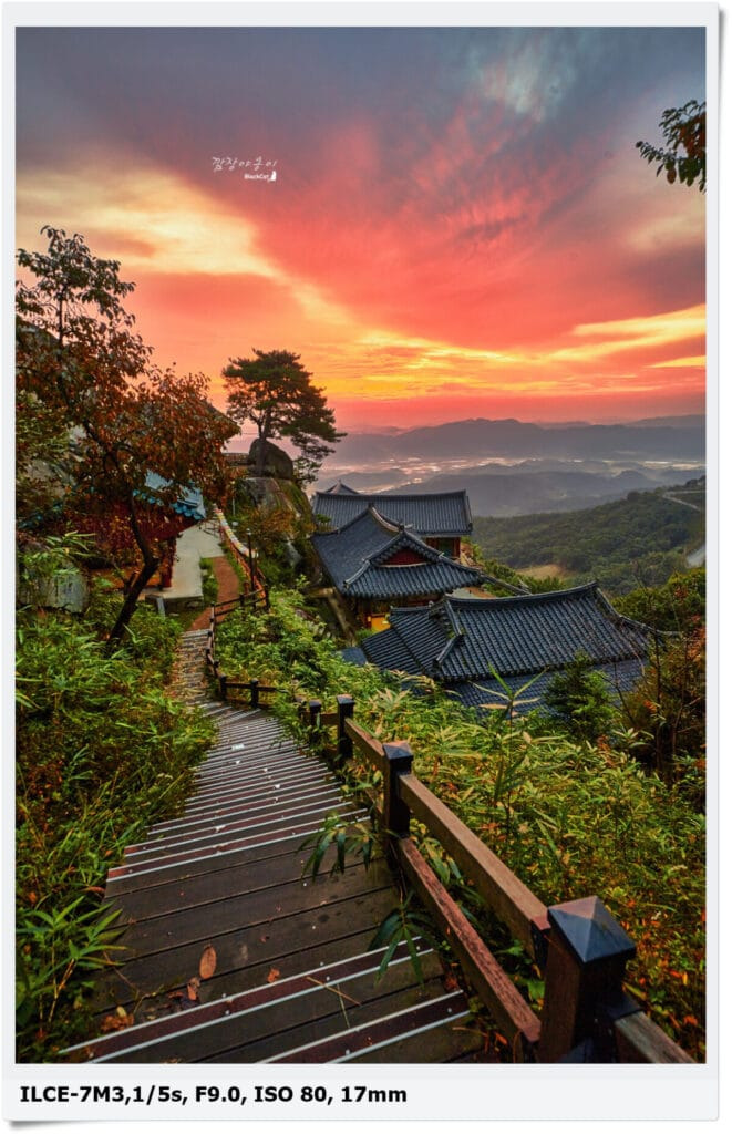 절 뒤로 나 있는 목조계단이 첫번째 포토스팟이자 메인입니다. 이곳에서 일출을 촬영한다면 꼭 꼬불꼬불 S자 모양의 목조계단 휘어짐이 함께 화면에 나오도록 촬영하시면 됩니다.