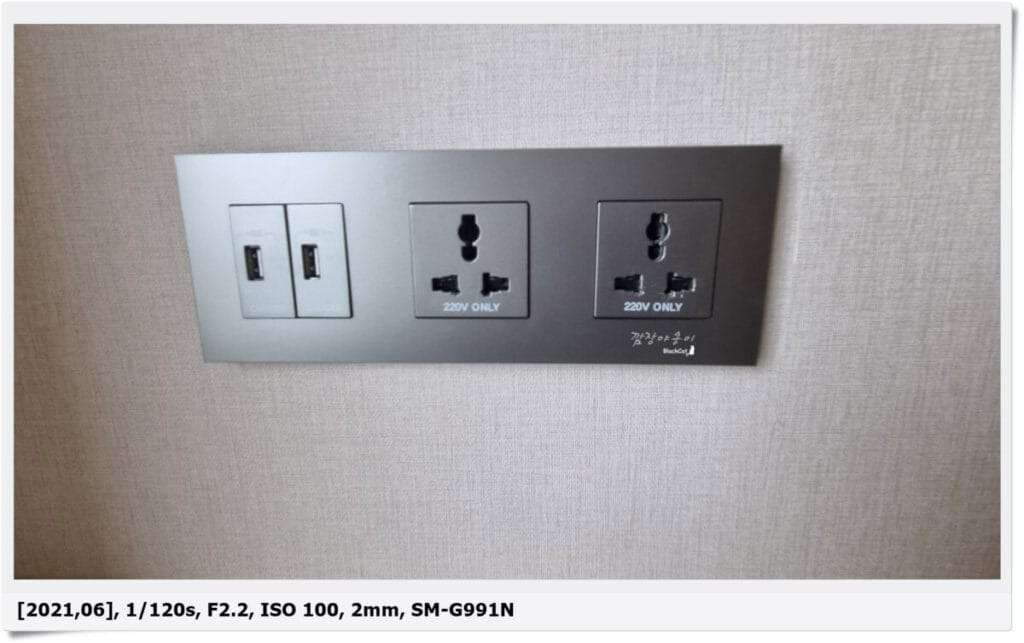 호텔이라 외국 손님이 많이 와서 그런지 내부에 국내 뿐만 아니라 중국 등 외국의 제품도 220V면 모두 사용할 수 있는 유니버셜 콘센트 (다국적 콘센트)로 되어 있네요.