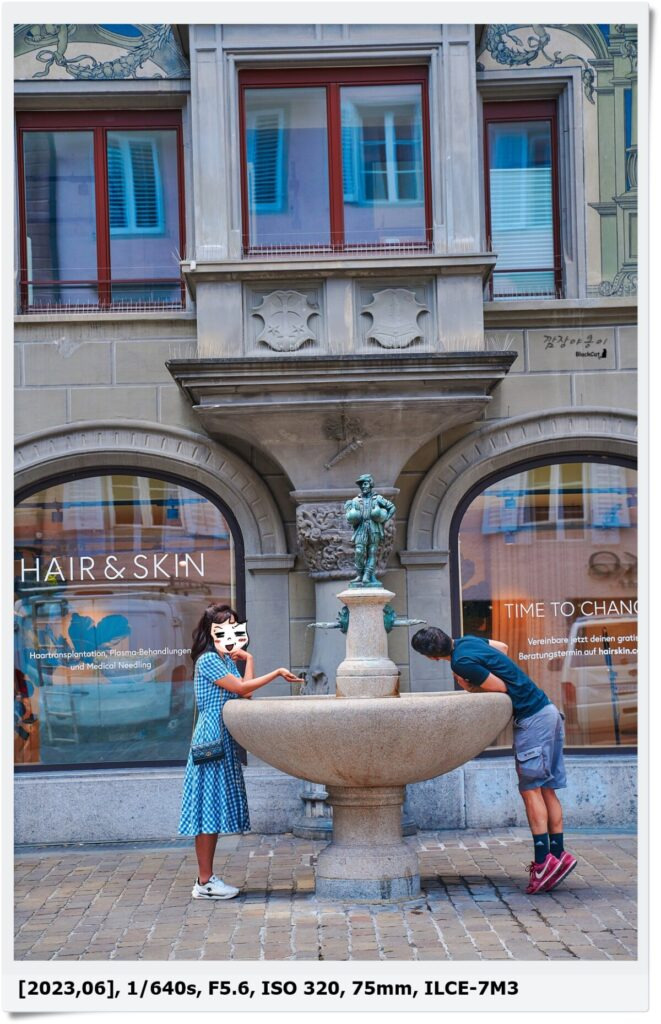 스위스에선 분수대가 참 많은데 모양도 크기도 모두 재각각입니다. 그리고 이 분수대에서 나오는 물을 그냥 마셔도 됩니다. 호텔이나 식당에서도 생수는 돈을 받고 수돗물은 무료로 준답니다.