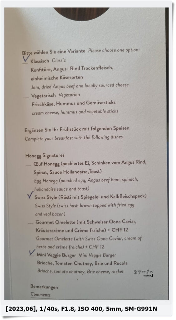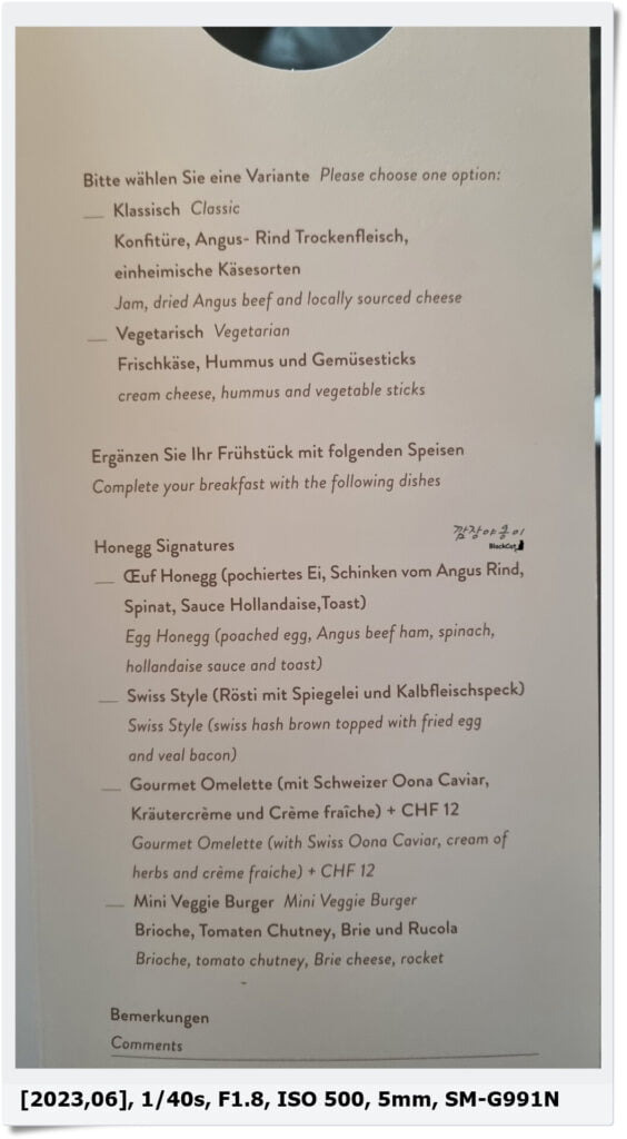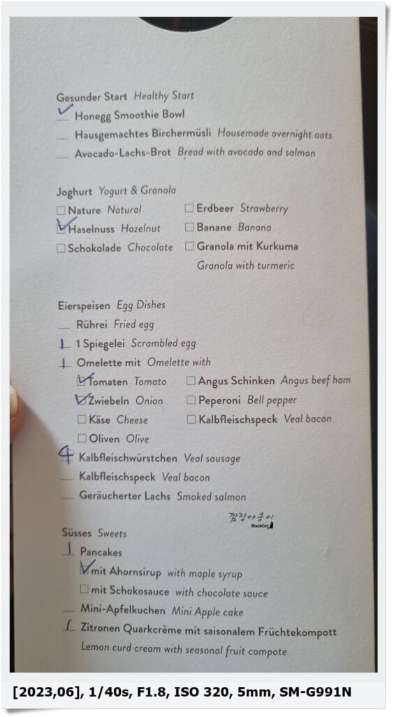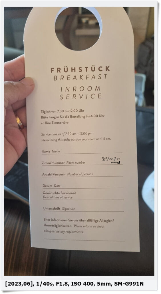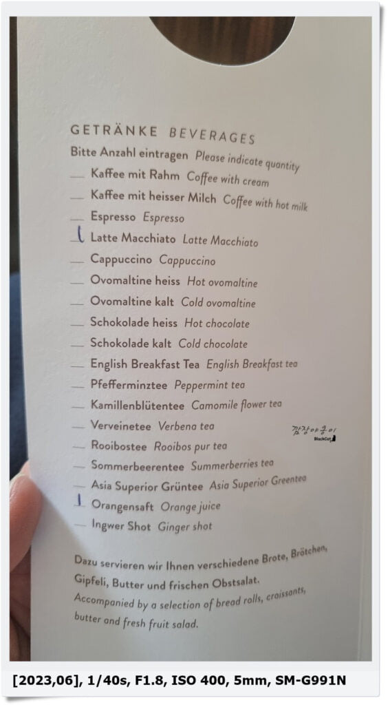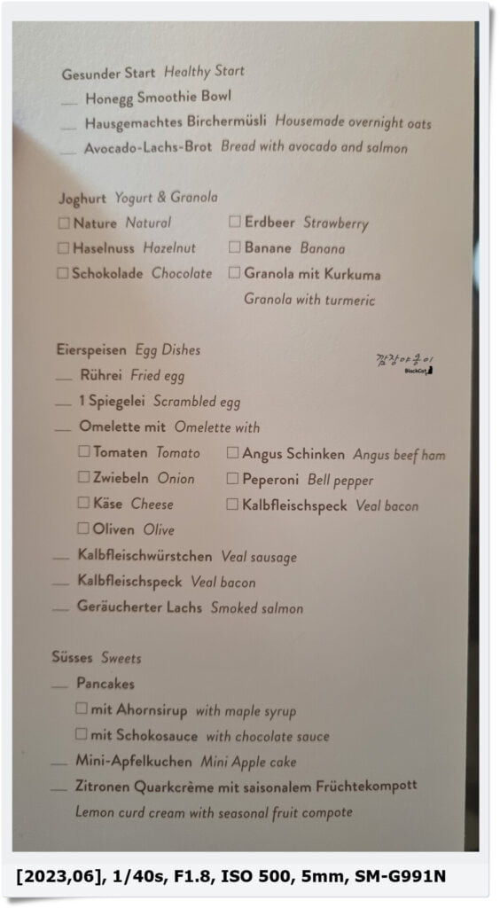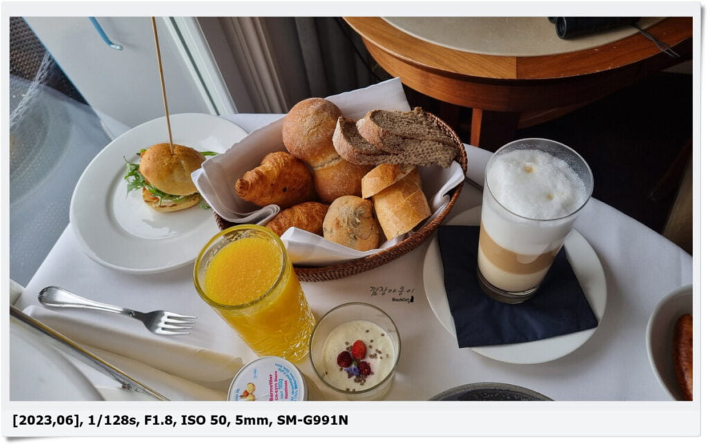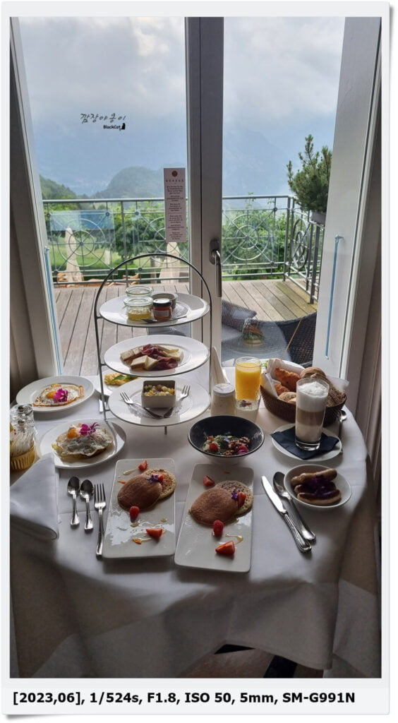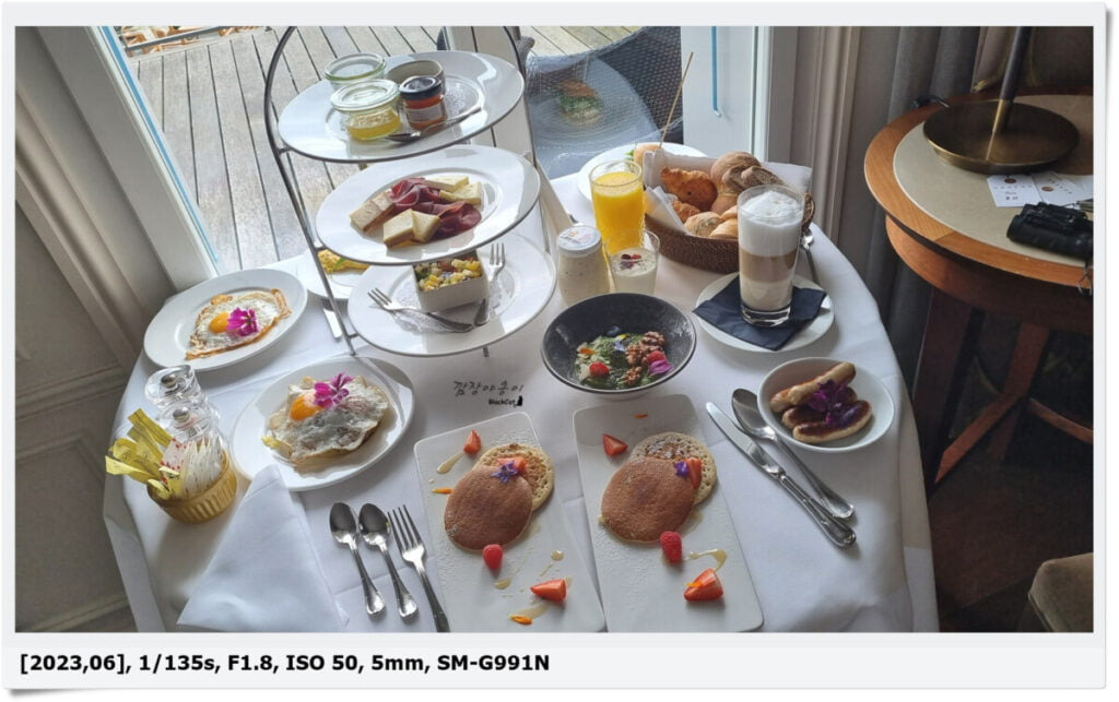 조식을 2번 먹을 거니까 ㅎㅎ 1번은 룸으로 1번은 가서 먹었네요. 둘 다 너무 좋고 장단점이 있어서 뭐를 더 추천한다고 말씀드리긴 어렵답니다. 다만, 날씨가 좋으면 룸으로 시켜서 테라스에서 먹는 걸 추천드려요…저희는….못했지만… 종류도 굉장히 많고 그 전날 새벽 4시까지 체크해서 문앞에 걸어두면 조식 시간에 방으로 룸서비스가 온답니다. 정말 한카트 가득 싣고 오셔서 그리고 너무 이뻐서 깜짝 놀랐답니다. 워낙 많이들 이렇게 시키다 보니 시킨 거 중에 안 온 것도 있고 ㅎㅎ 그치만 이미 너무 많아서 그냥 뒀답니다.