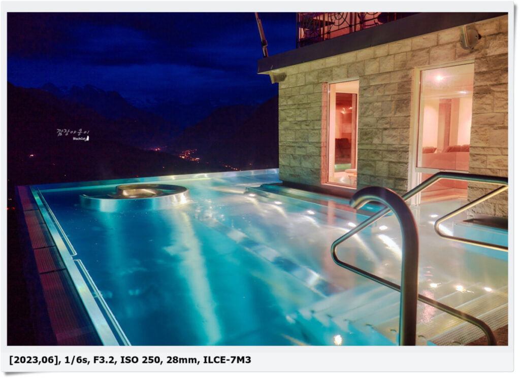 저녁에는 수영장에 불이 켜지면서 또 다른 멋이 있는데 저희는 사진에는 잘 안보이지만 비가 오고 있는 상황이라 저녁에는 비를 맞으며 짧게 수영을 즐겼네요 ㅎ