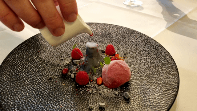 마지막으로 디저트~~ 앙증맞은 화산에 산딸기라니….. 그닥 달지도 않고 마무리로 딱이었네요.