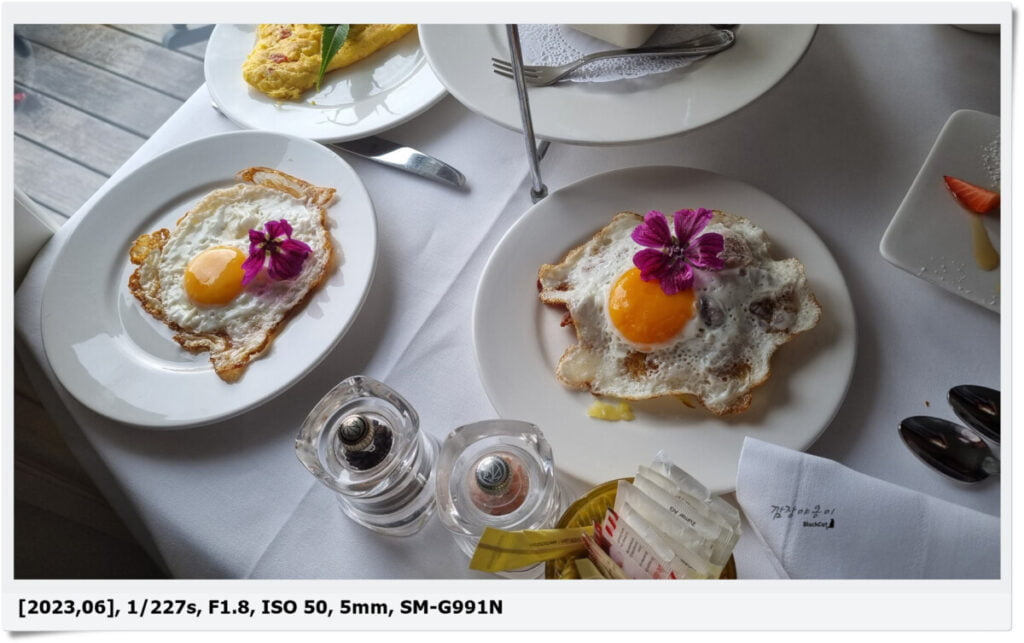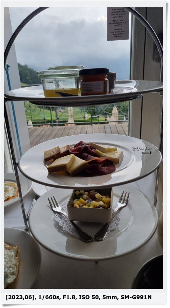 다음날은 룸으로 시키지 않고 가서 먹었는데,,, 조식이 12시까지 제공되다 보니 저희만 너무 이른 시간에 가서 ㅎㅎ 음식이 나오는 데 한참 걸렸네요. 3단 트레이는 기본으로 제공되는 것이고 다른 건 시킬 때마다 해서 갖다 주시는데요. 시키고 나서 조리를 하다 보니 시간이 꽤 걸린답니다. 시간 타이밍을 잘 계산해서 시키시면 바로바로 끊기지 않고 따뜻하게 조리된 음식을 먹을 수 있답니다. 내려와서 먹으니 좋은 점은 버터를 계속 리필할 수 있다는 거 ~ 음식이 계속 따뜻하다는 거~~~ 다만 뷰가 좀 아쉽죠~ 그래도 두 번 다 아주 만족스럽게 먹었답니다.