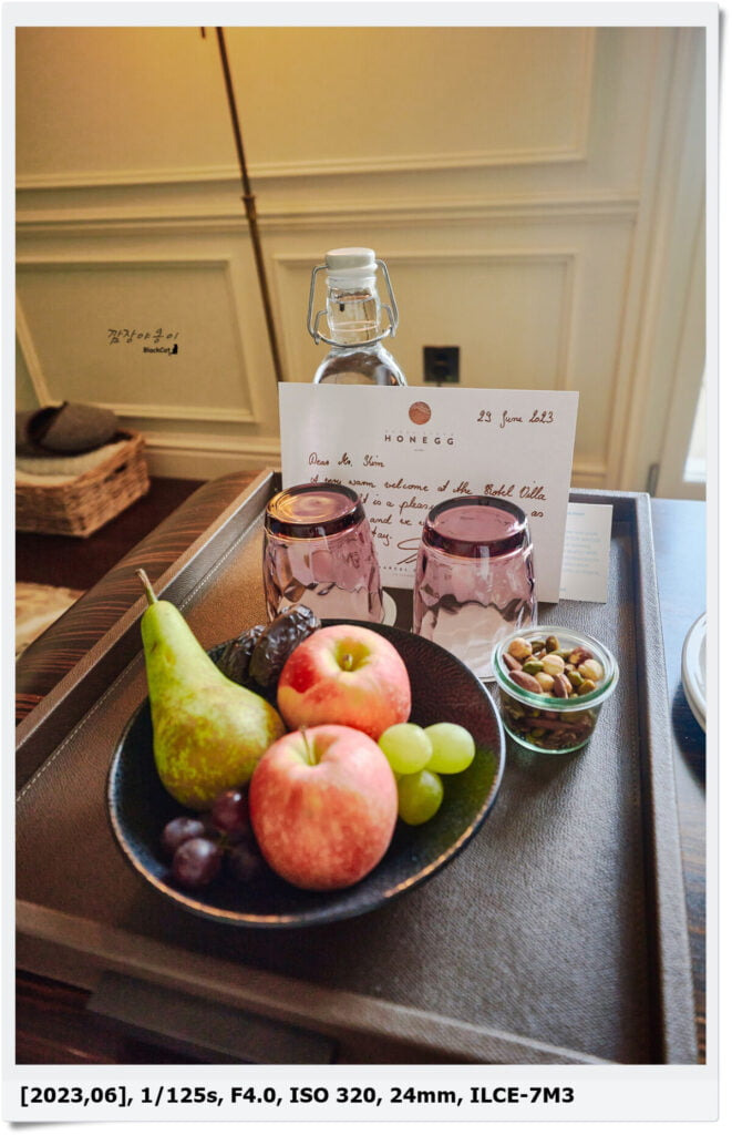직접 손으로 쓴듯한 편지와 과일 그리고 쌍안경이 방에 있었는데요. 이곳의 풍경이 매우 예쁜편이라 그런지 쌍안경도 준비되어 있던데 저희가 방문했을땐 날씨 도움을 제대로 못받아 쌍안경은 그닥 필요가 ㅠㅠ