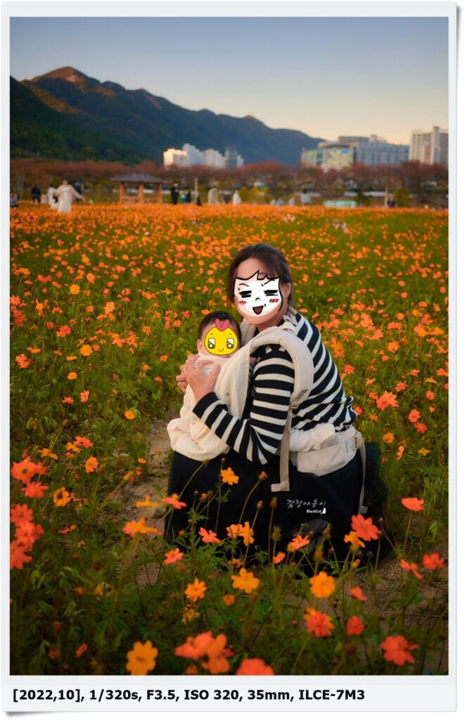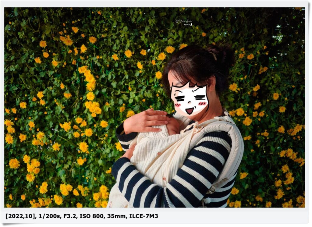 울 햇살이 초상권을 위해 얼굴을 가리다보니 사진이 느낌이 많이 죽어서 참 아쉽네요.. 자연스러운 표정으로 뒤에 배경으로 붉고 주황빛의 국화가 잘 나왔는데..